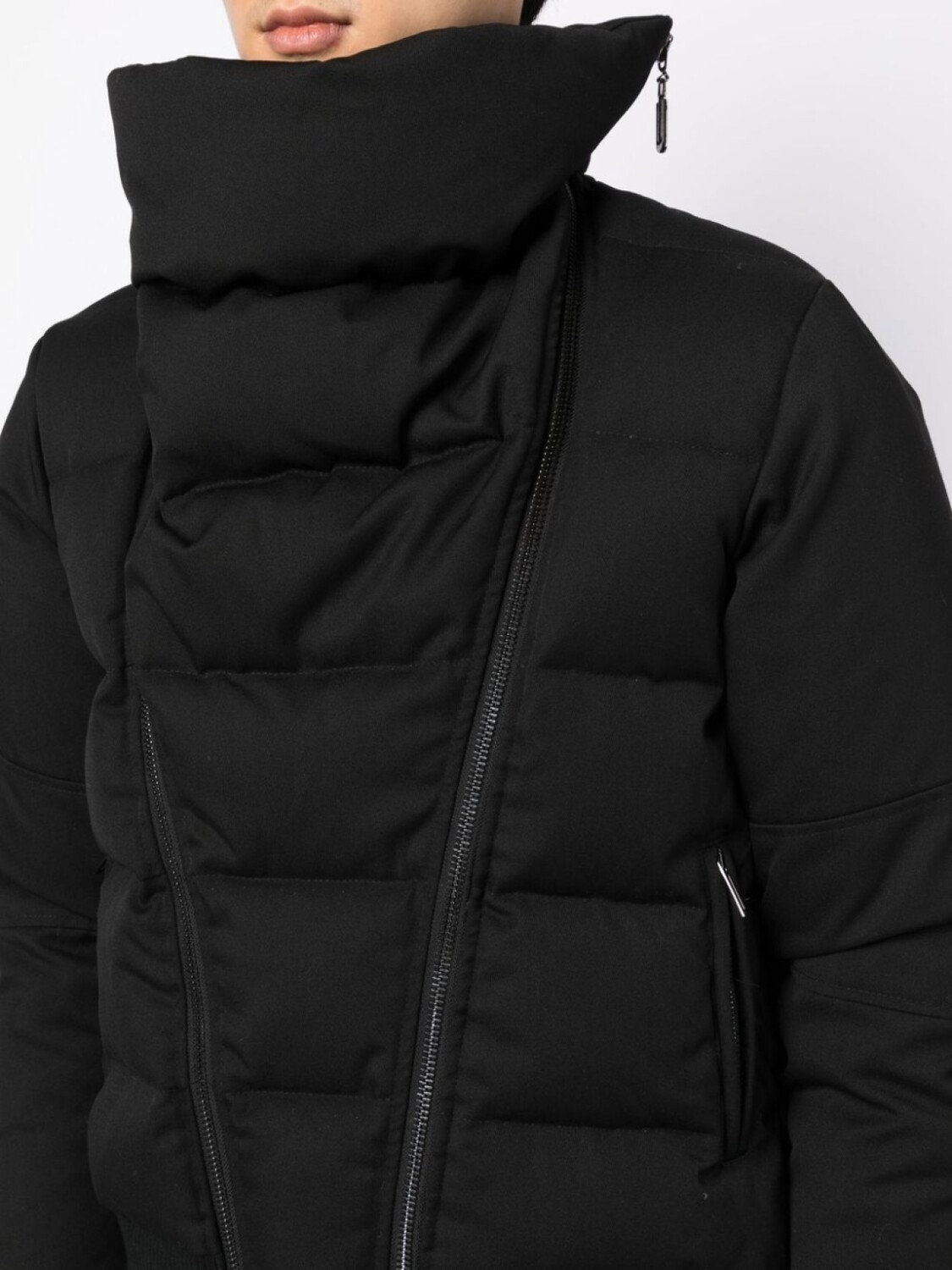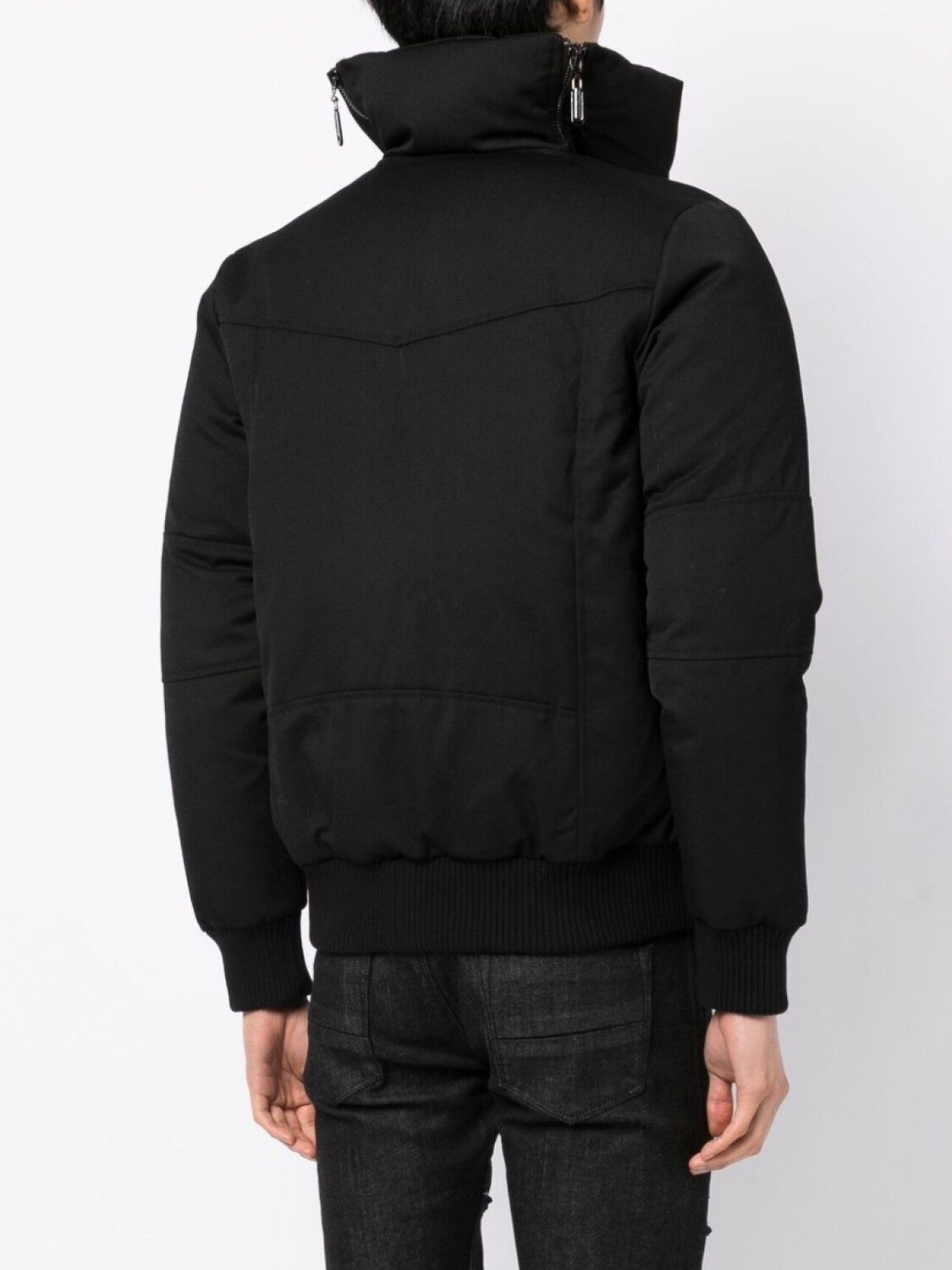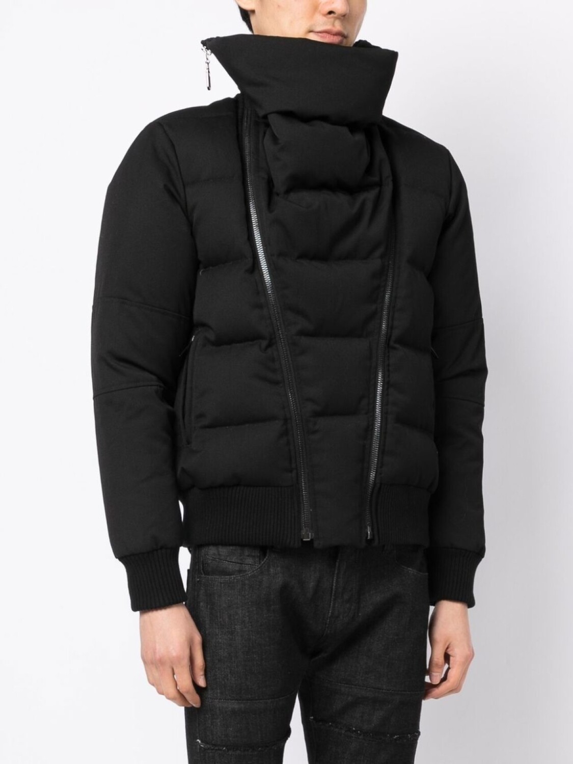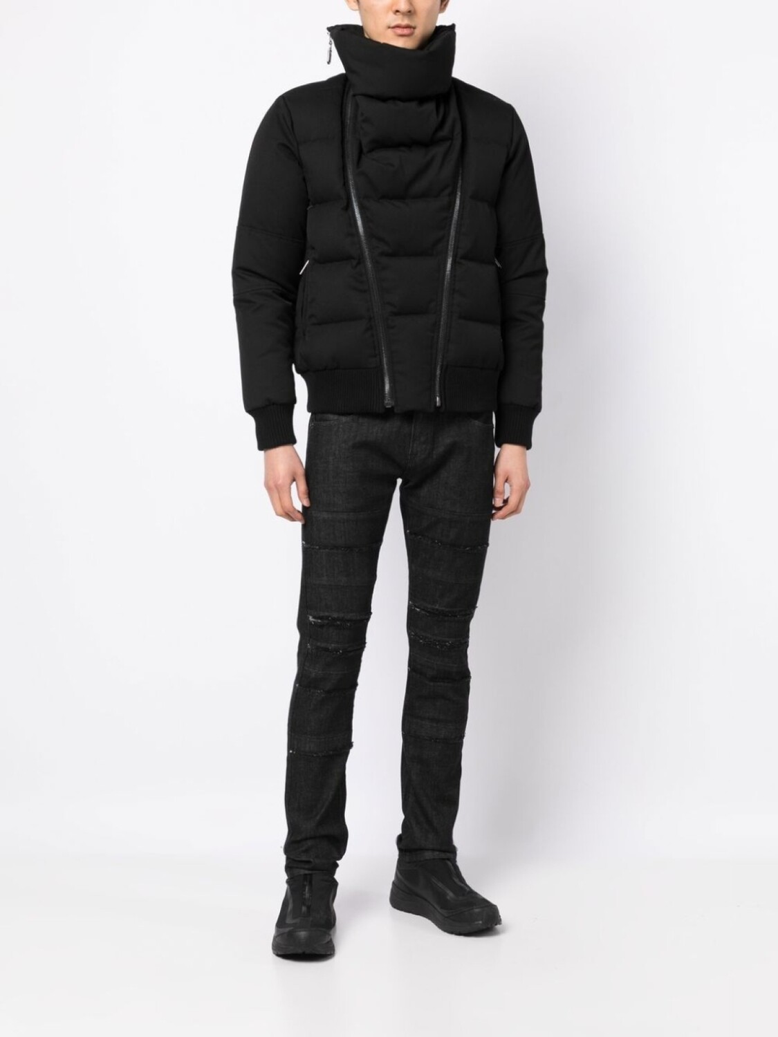 Черный, дутый материал, воротник-стойка, съемный воротник, застежка на молнии спереди и длинные рукава.