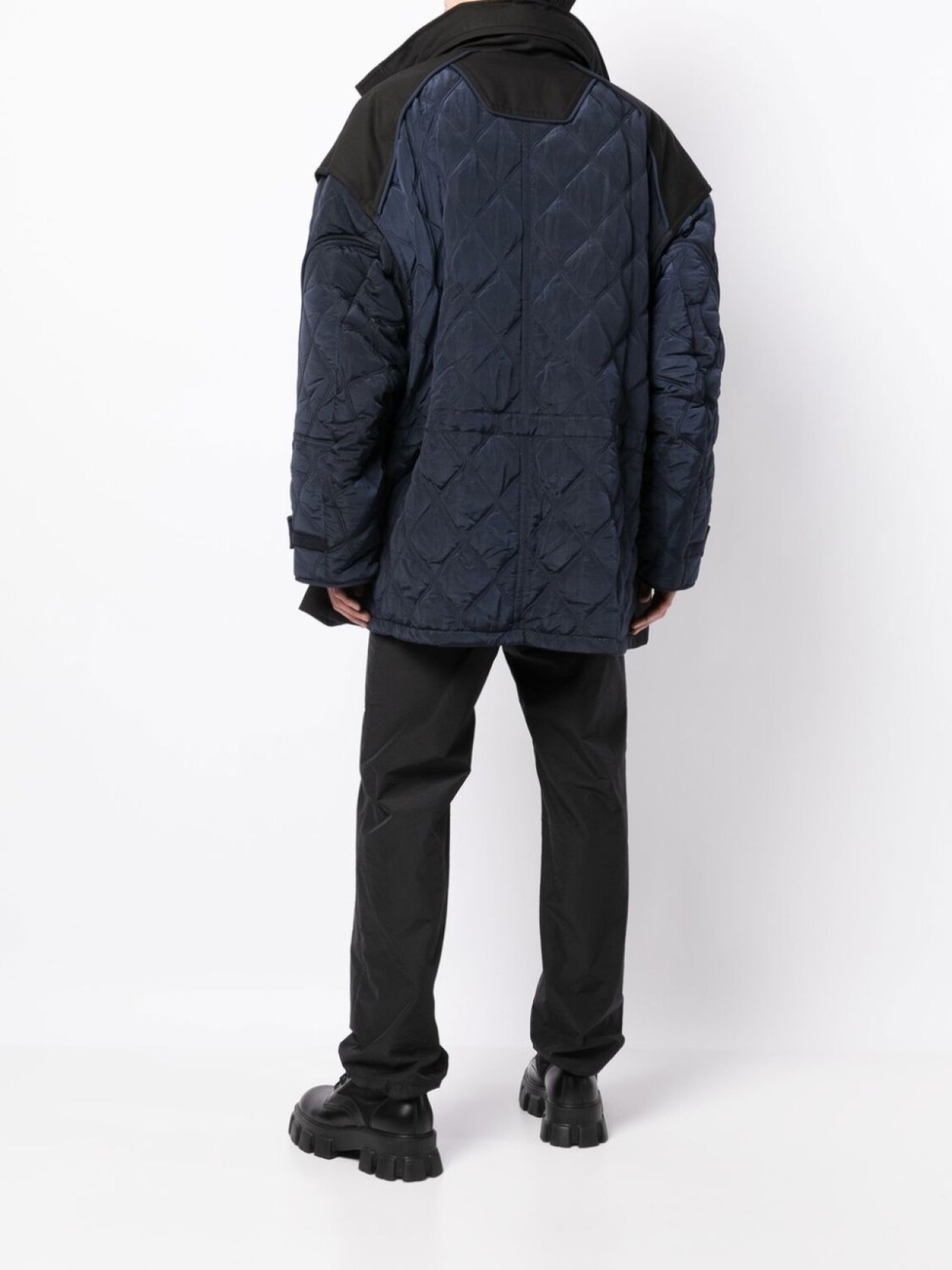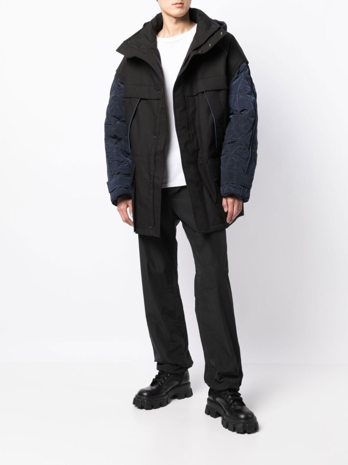 Черный, смесовый хлопок, дутый материал, стеганые вставки, высокий воротник, классический капюшон, застежка на кнопки и молнию спереди, длинные рукава, два нагрудных кармана с клапанами, два передних кармана с клапанами и прямой подол.