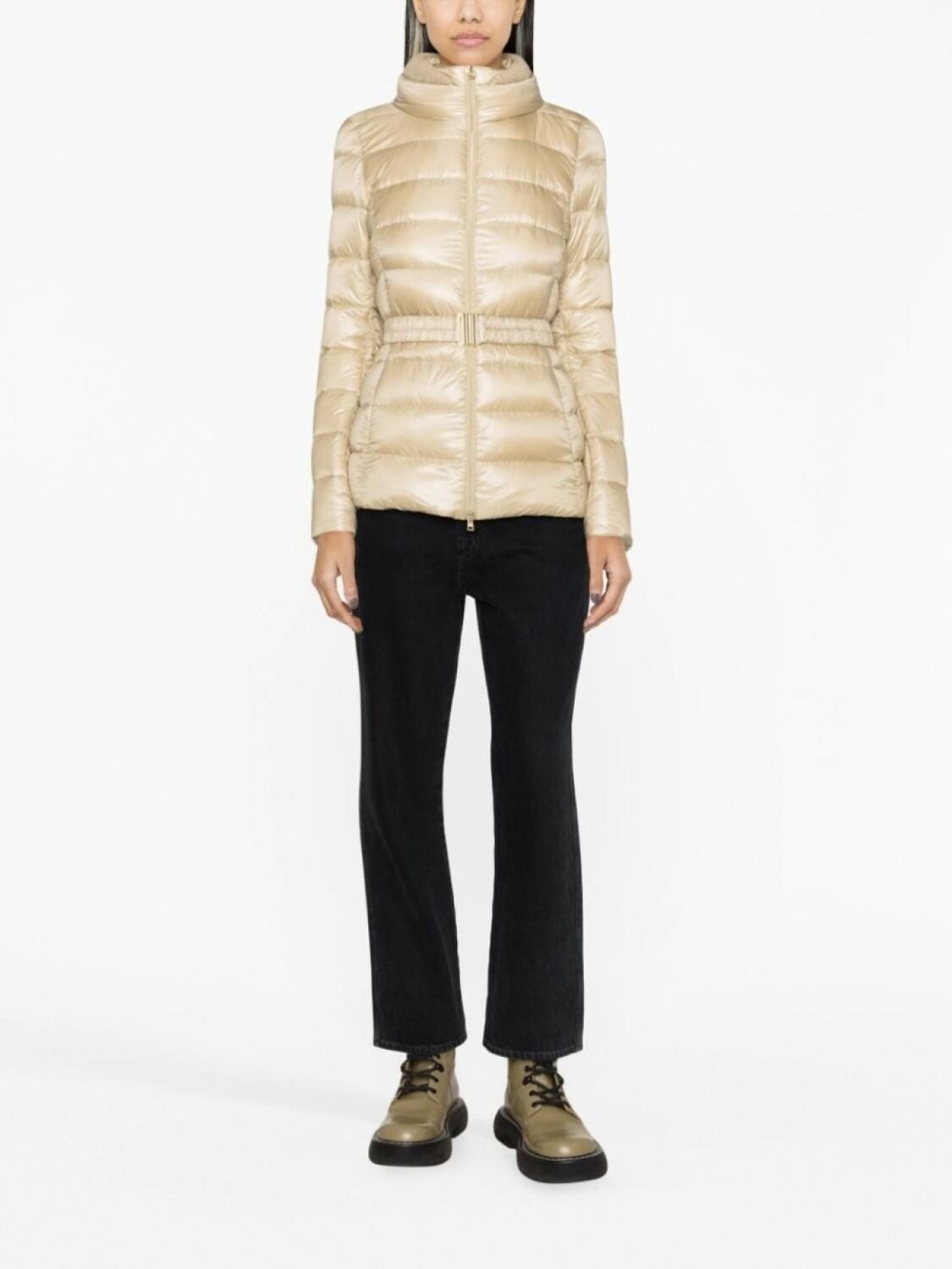 Светло-бежевый, гусиный пух, покрытие с эффектом металлик, дутый материал, детали в рубчик, серебристая фурнитура с выгравированным логотипом, высокий воротник, двусторонняя молния спереди, длинные рукава, ремень на талии, передние карманы на молнии и прямой подол.