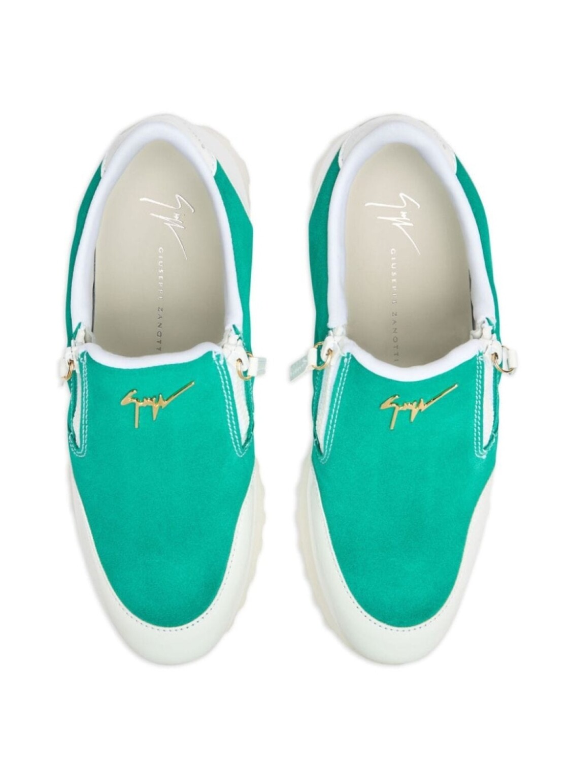 Зеленый, замша, золотистый металлический логотип, контрастные вставки, закругленный носок, застежка на молнии сбоку, стелька с логотипом, резиновая подошва