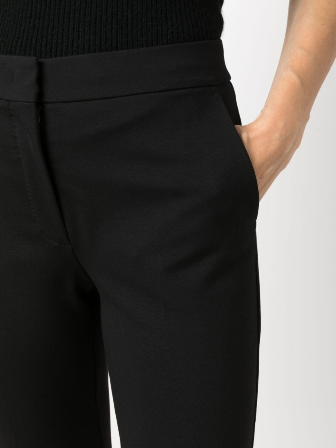 Черный, завышенная талия, потайная застежка спереди, укороченная длина и два прорезных кармана по бокам.