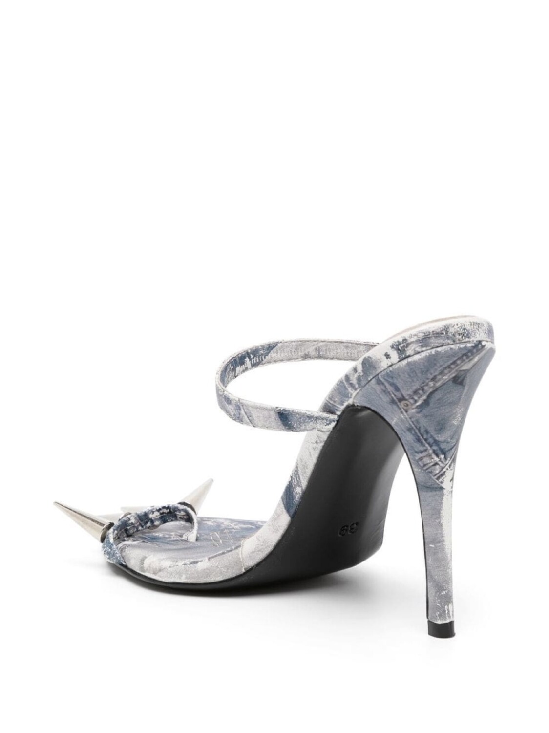 Синий, кожа, заклепки-шипы, деним в технике пэчворк, высокий каблук, ремешок на щиколотке, заостренный носок и кожаная стелька с логотипом.