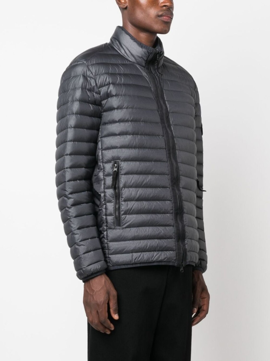 Темно-серый, утиный пух, дутый материал, знаковая деталь в виде компаса, нашивка с логотипом на рукаве, застежка на молнии спереди, карман на молнии спереди, длинные рукава и прямой подол.