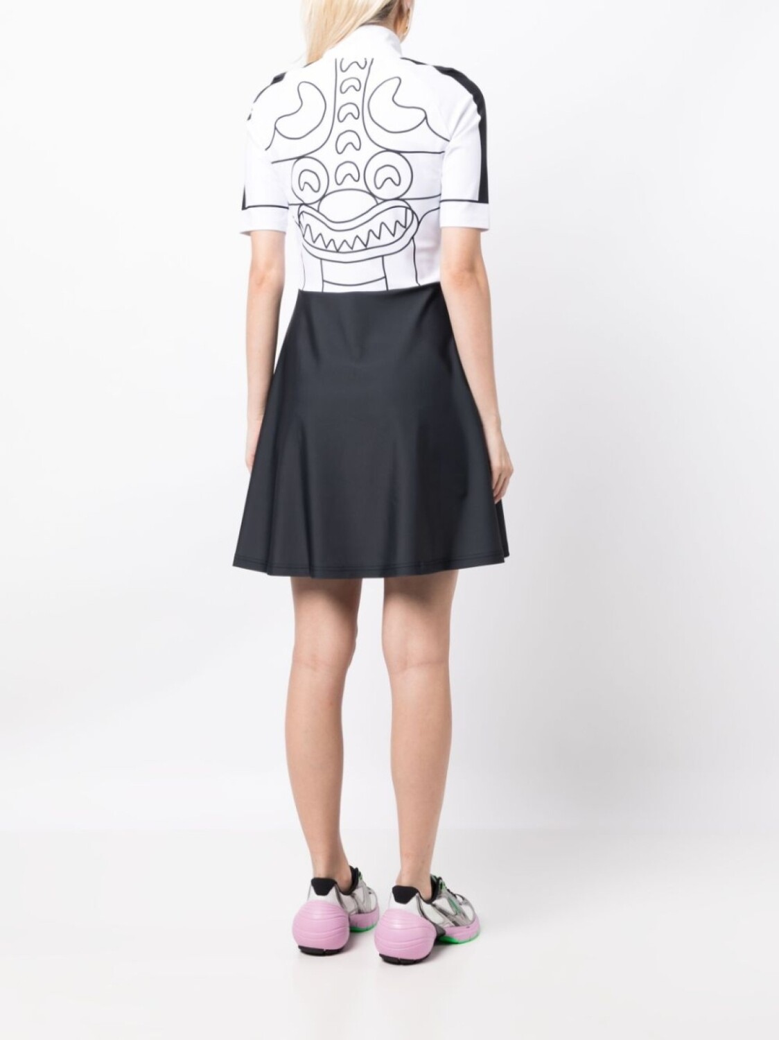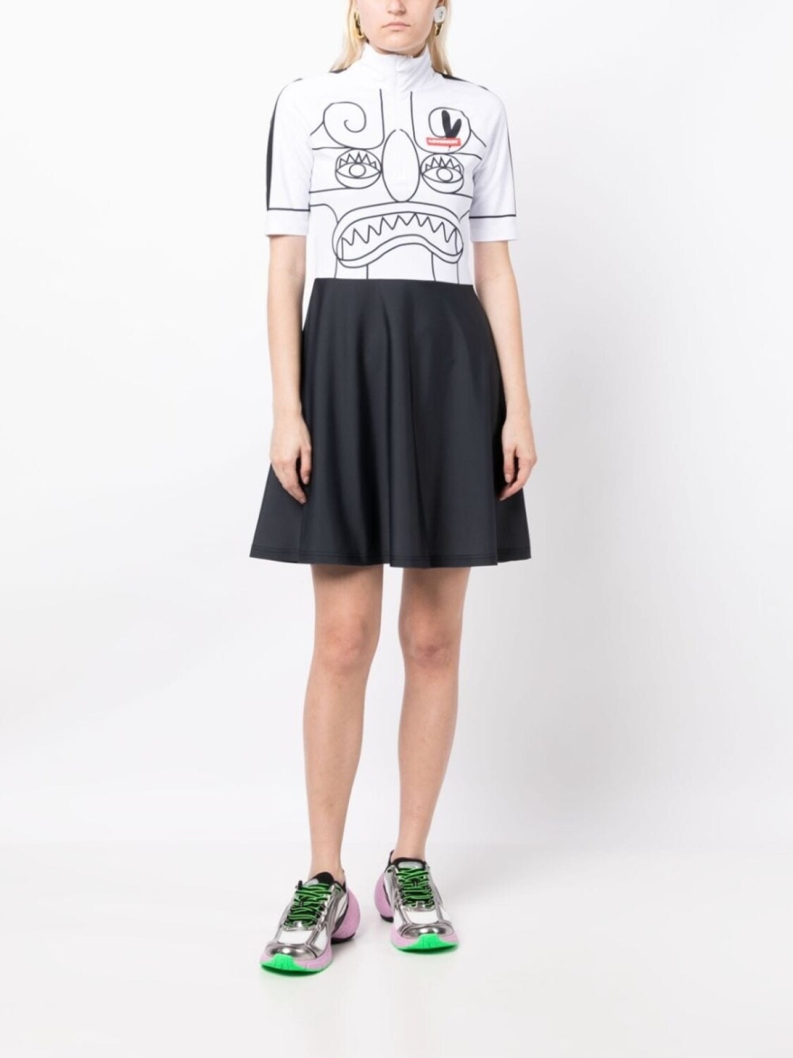 Белый/черный, принт с изображением эскиза, принт с изображением смайла, дизайн колор-блок, полоска сбоку, нашивка с логотипом на груди, высокий воротник, застежка на молнии спереди, короткие рукава, расклешенная юбка и длина выше колена.