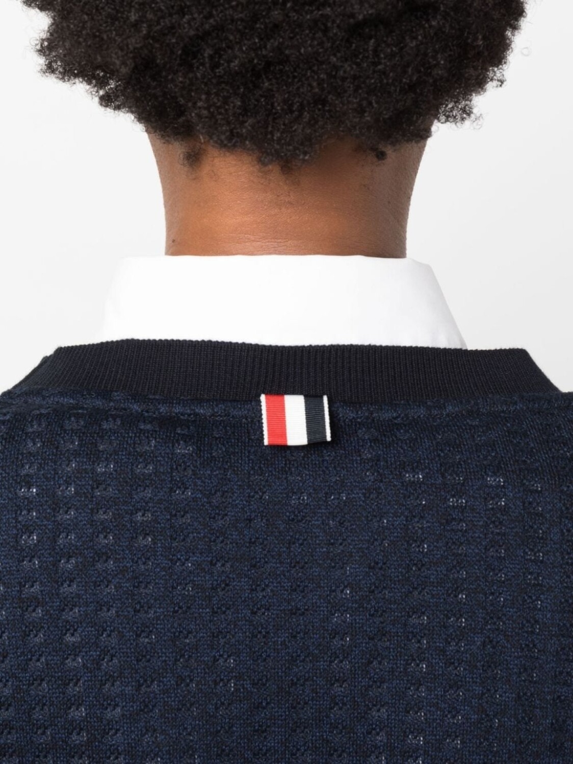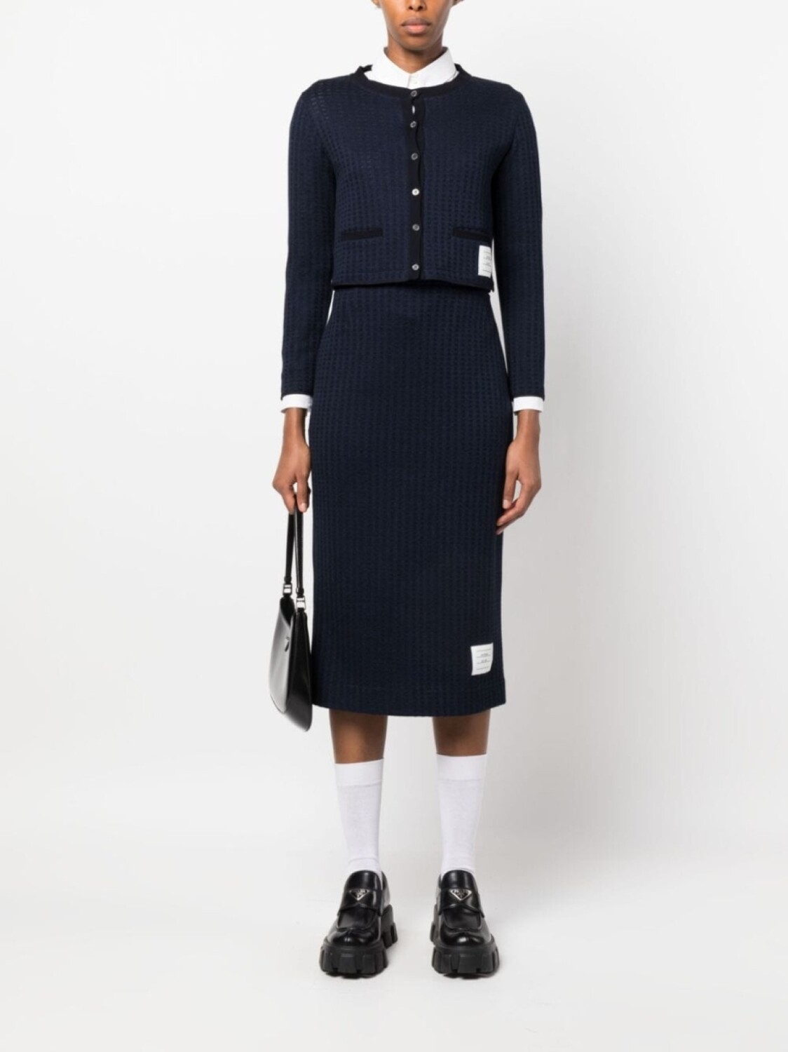 Темно-синий, хлопок, жаккард, круглый вырез, застежка на пуговицах спереди, два накладных кармана спереди, ярлык с полосками 4-Bar, длинные рукава, контрастная отделка и укороченная длина.