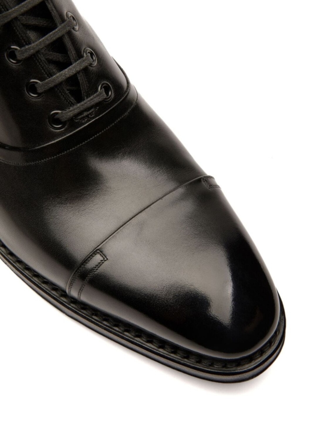 Черный, телячья кожа, гладкая текстура кожи, глянцевая фактура, петля для подтягивания сзади, высота по щиколотку, миндалевидный носок, шнуровка спереди, кожаная подошва и кожаная подкладка.