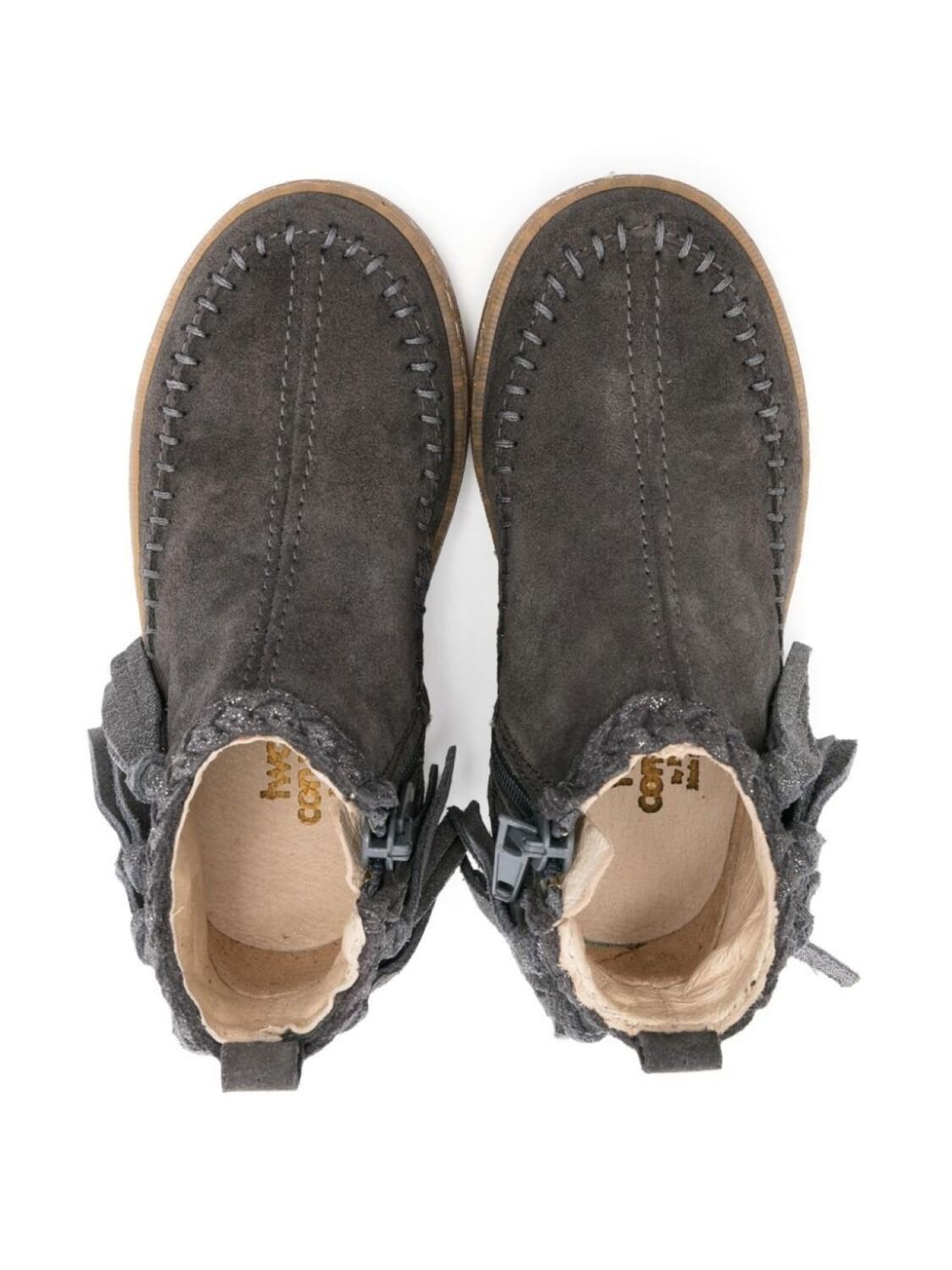 Антрацитово-серый, замша из телячьей кожи, блестящий материал, края с кисточками, закругленный носок, застежки на молнии сбоку, высота по щиколотку и резиновая подошва.