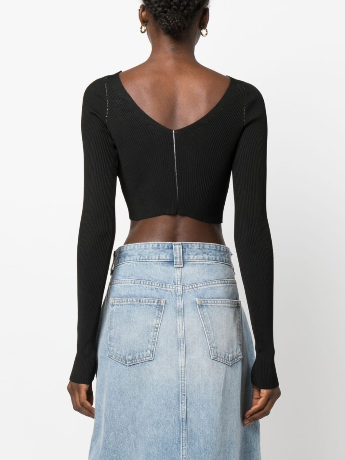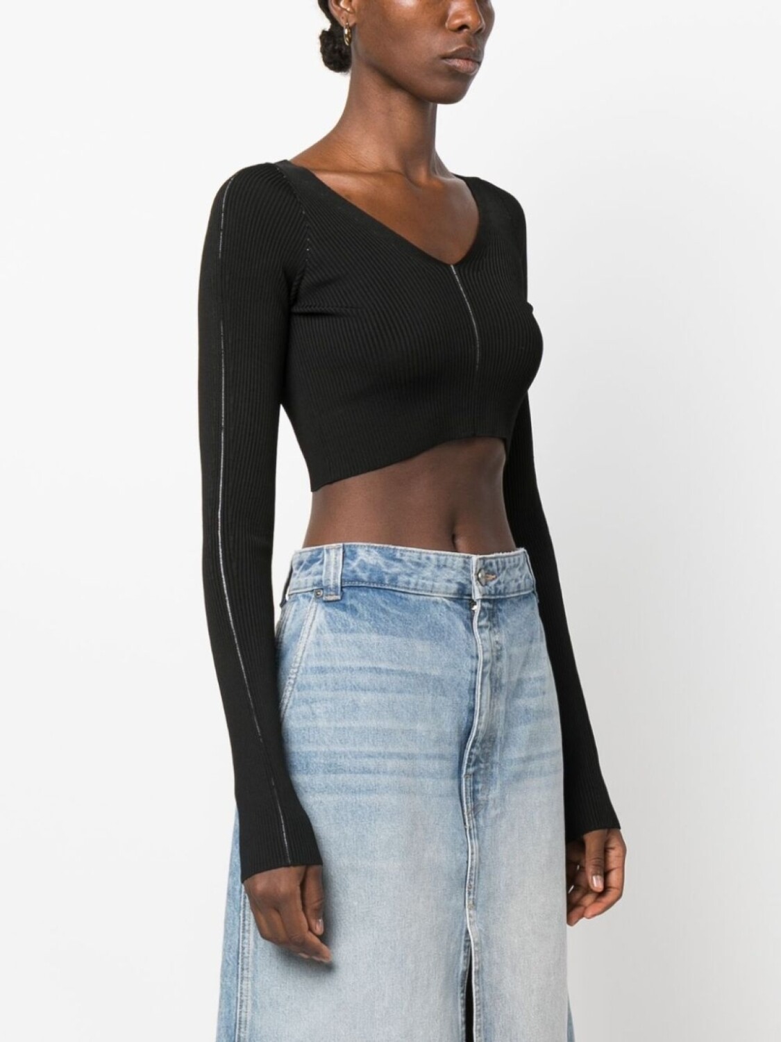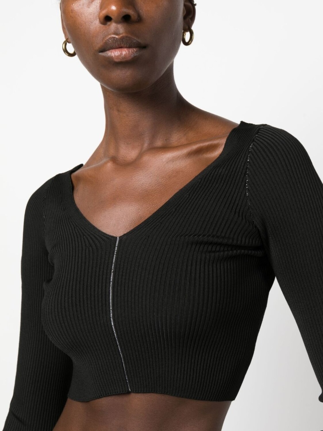 Черный, трикотажный материал, трикотаж в рубчик, декоративная строчка, V-образный вырез, длинные рукава, V-образный вырез сзади, прямой подол и укороченная длина.