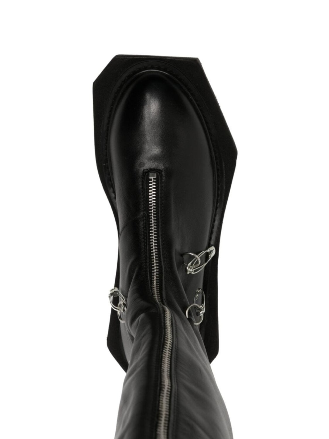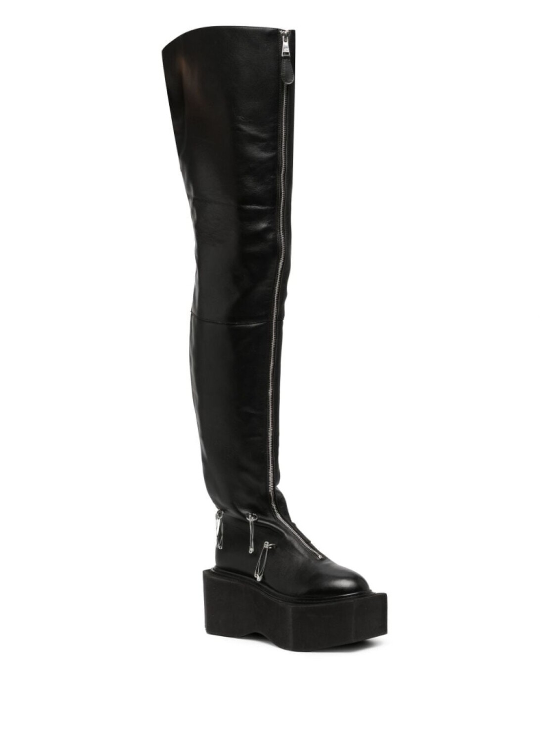 Черный, декор в виде кольца, декоративная булавка, асимметричный носок, застежка на молнии спереди, высота до линии бедра, массивная подошва, подошва на платформе и массивная резиновая подошва.