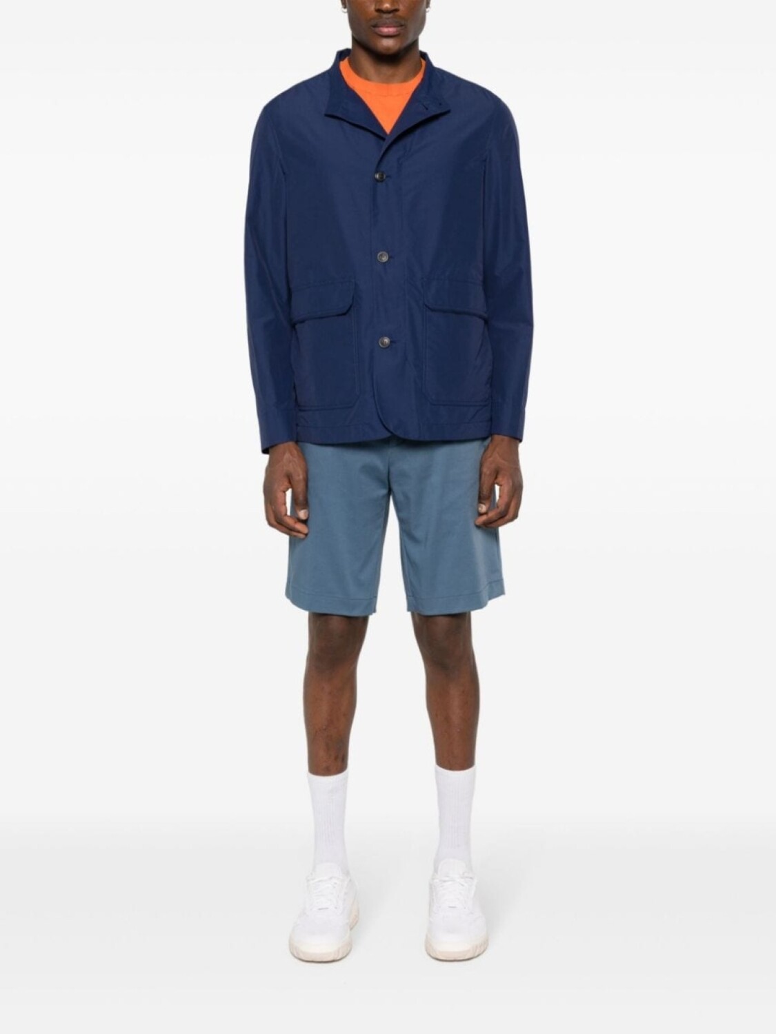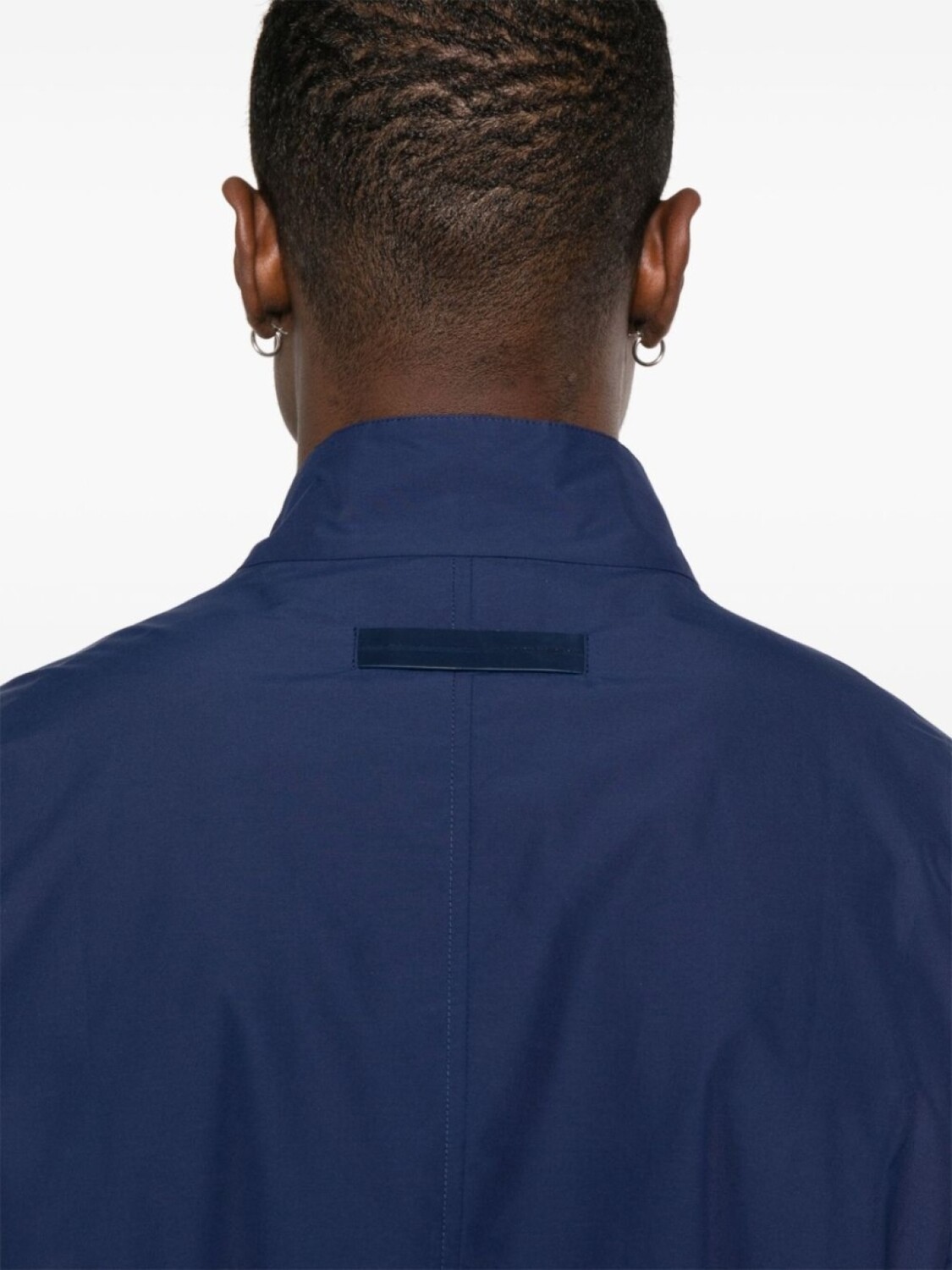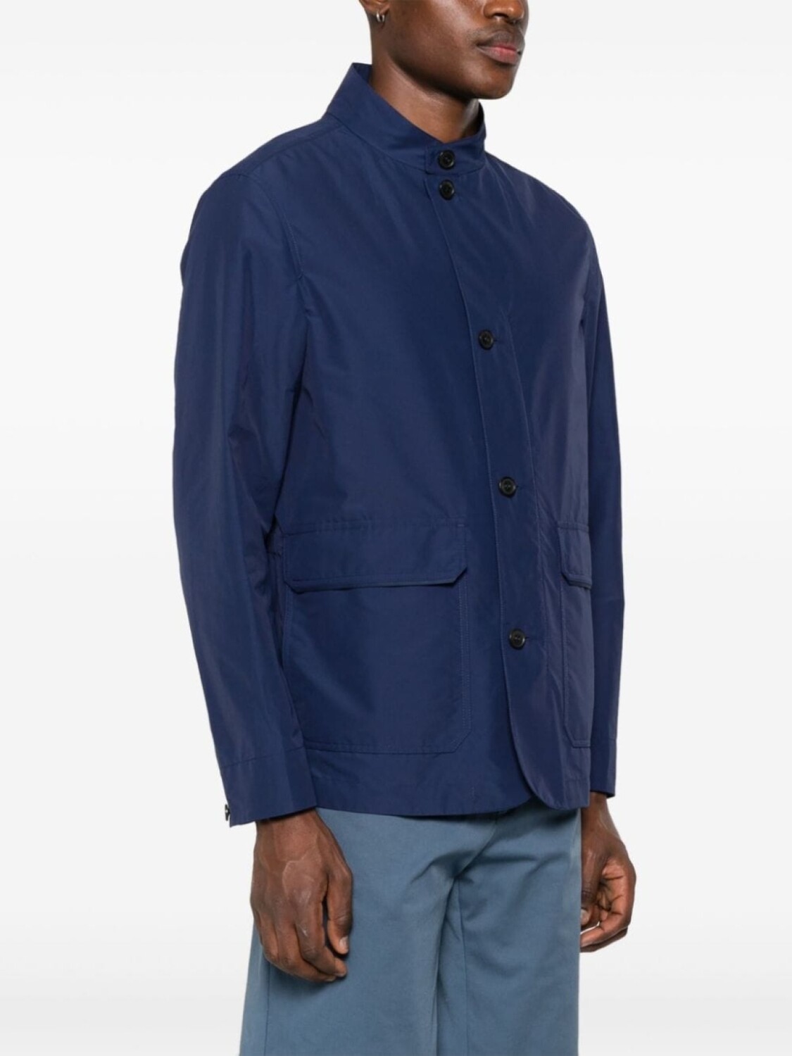 Темно-синий, смесовый хлопок, фактурная отделка, воротник-стойка, длинные рукава, манжеты на пуговицах, два кармана с клапанами по бокам, эластичные вставки, петелька на спине, прямой подол, застежка на пуговицах спереди