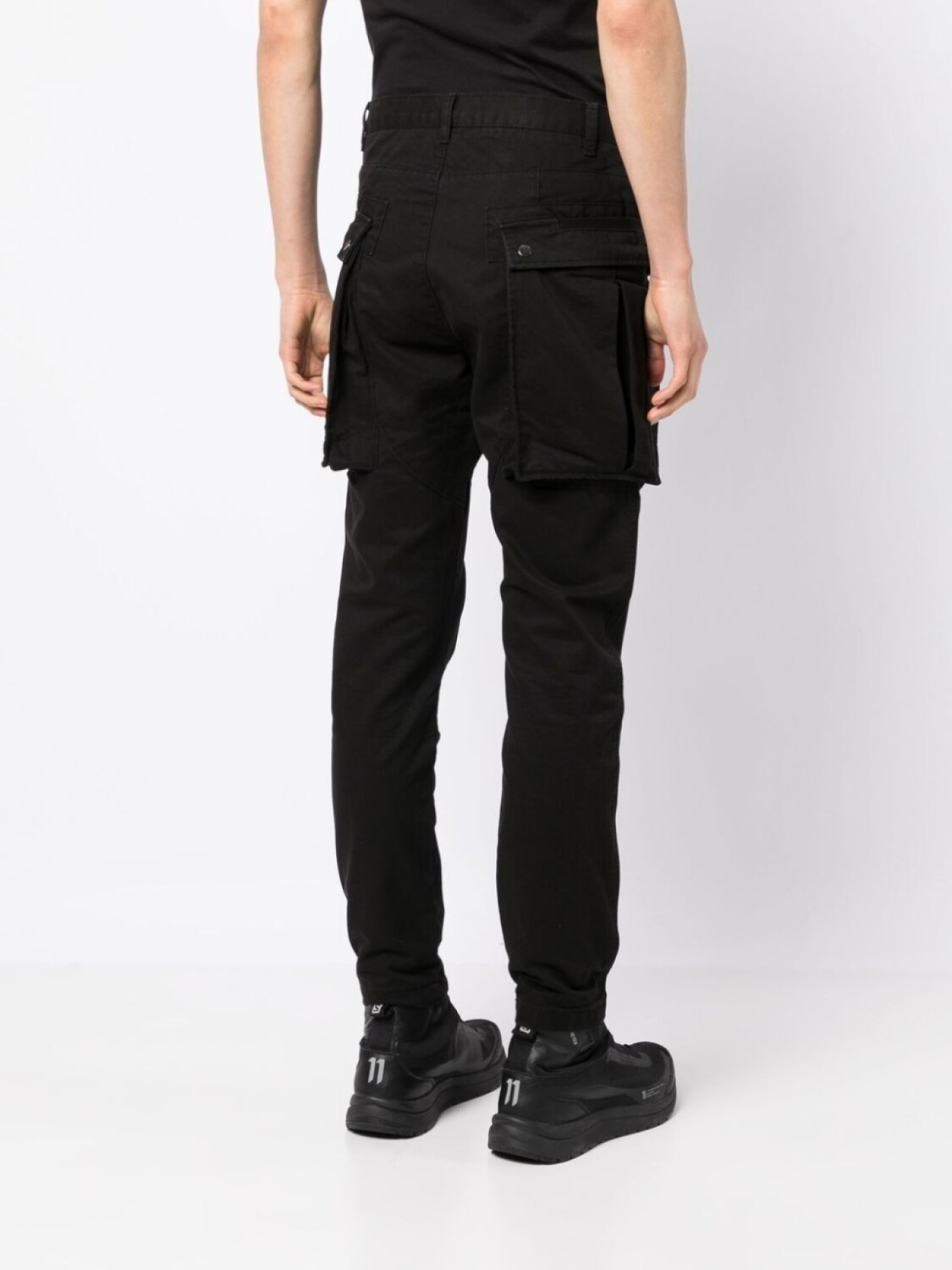 Черный, хлопок, низкий шаговый шов, петли для ремня, застежка на молнии и пуговице спереди и два накладных кармана по бокам.