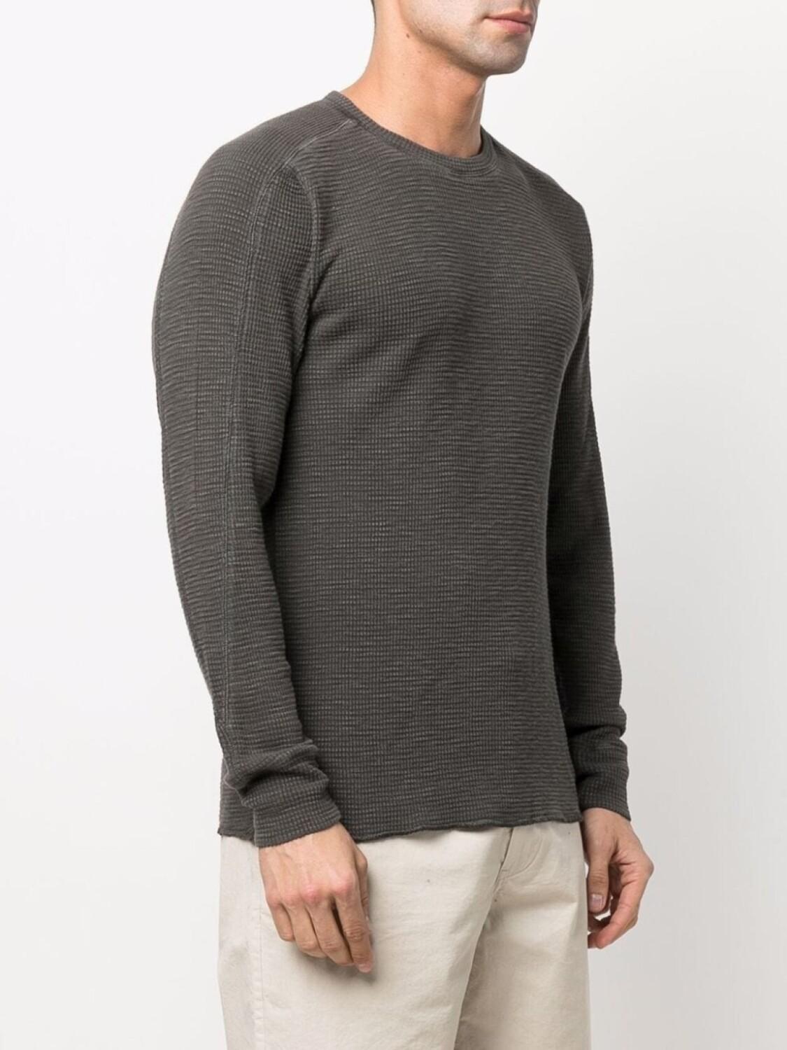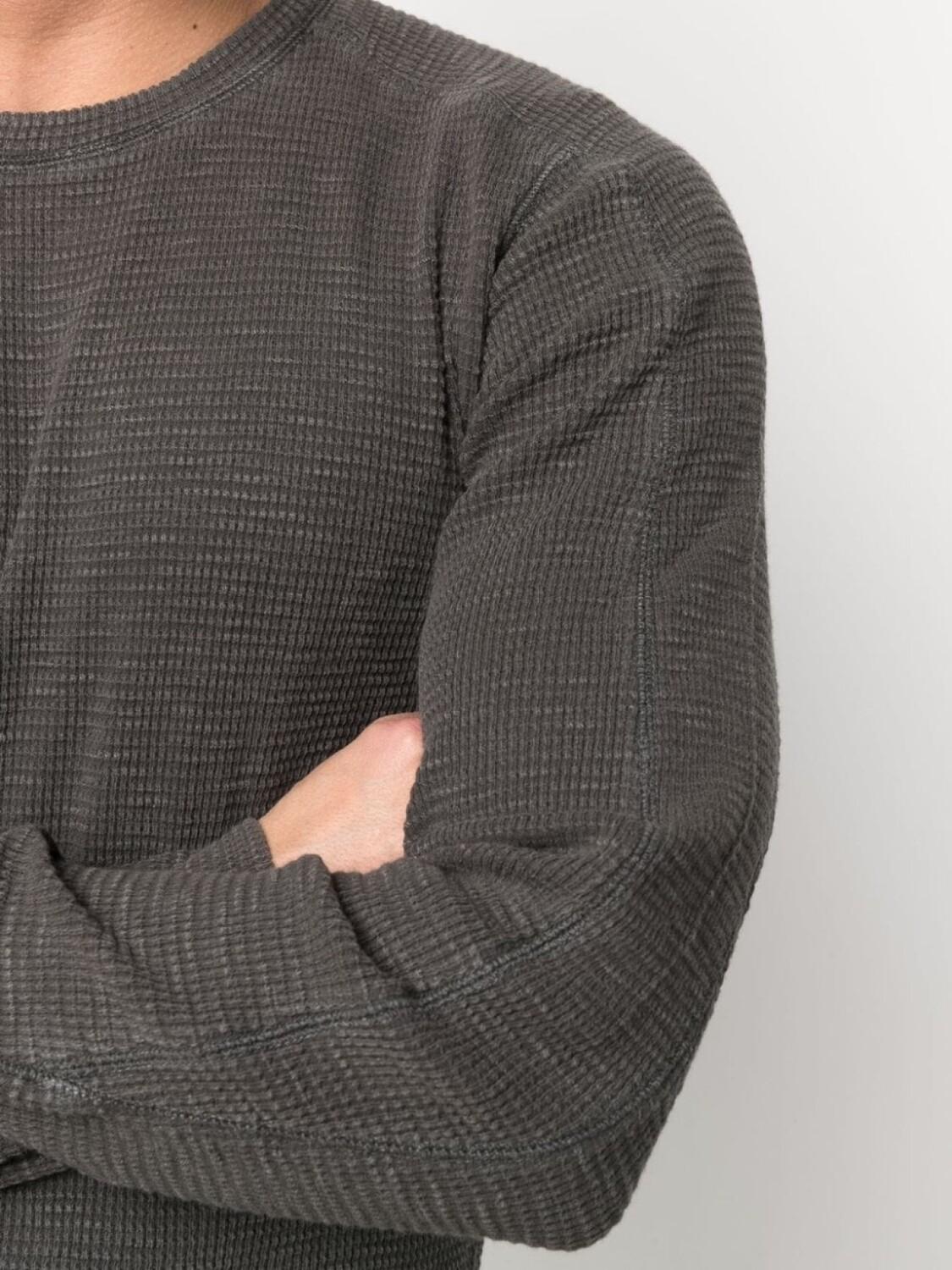 Вафельная вязка, круглый вырез, длинные рукава и прямой подол. Цвет: серый.