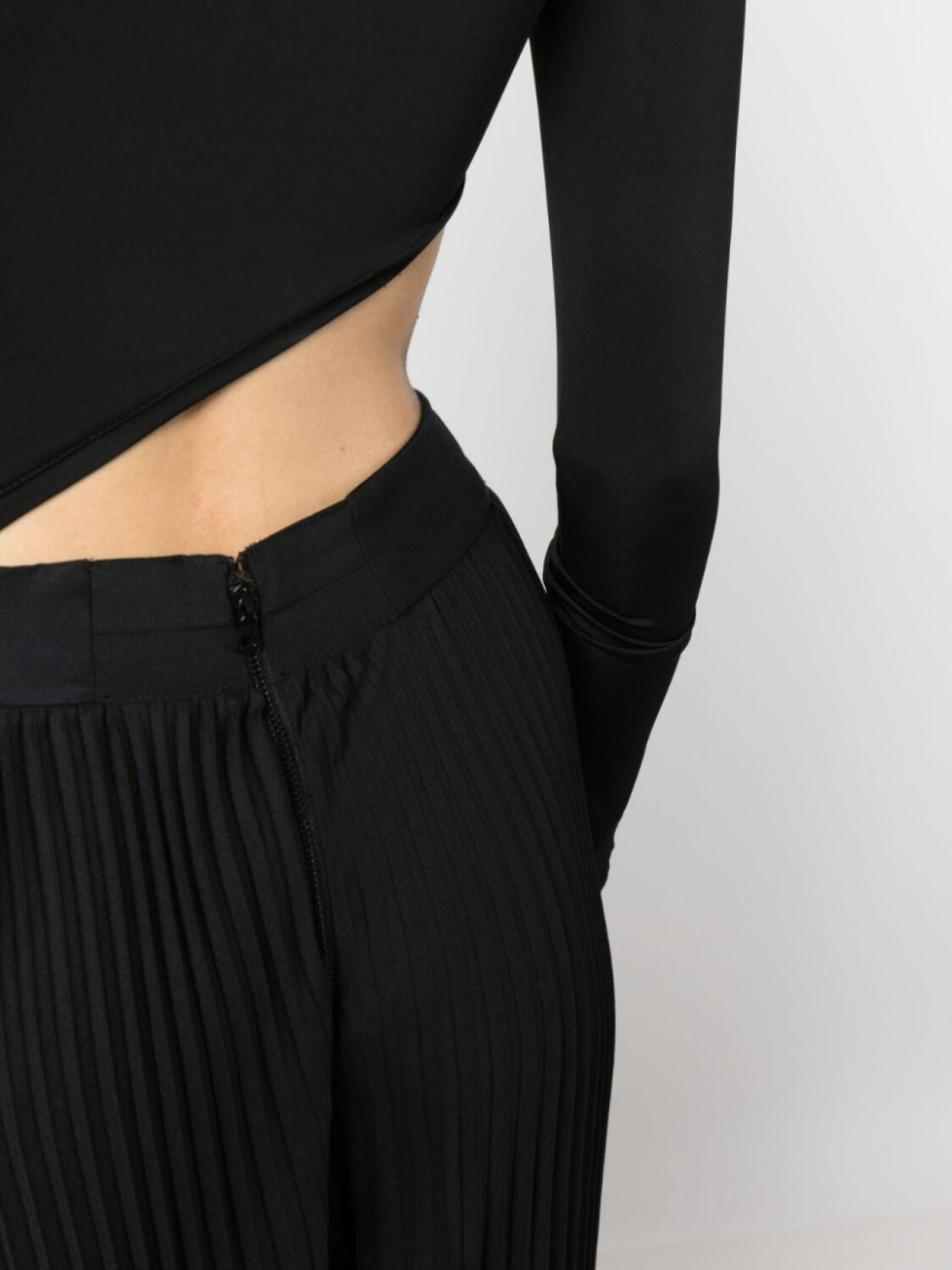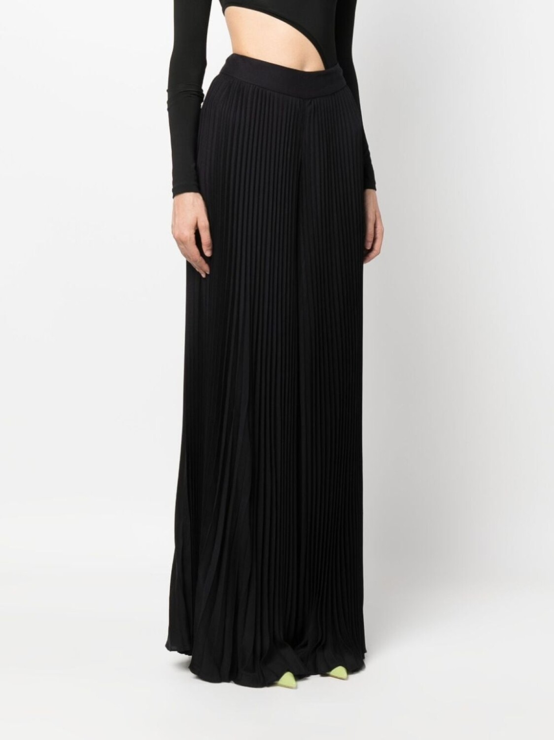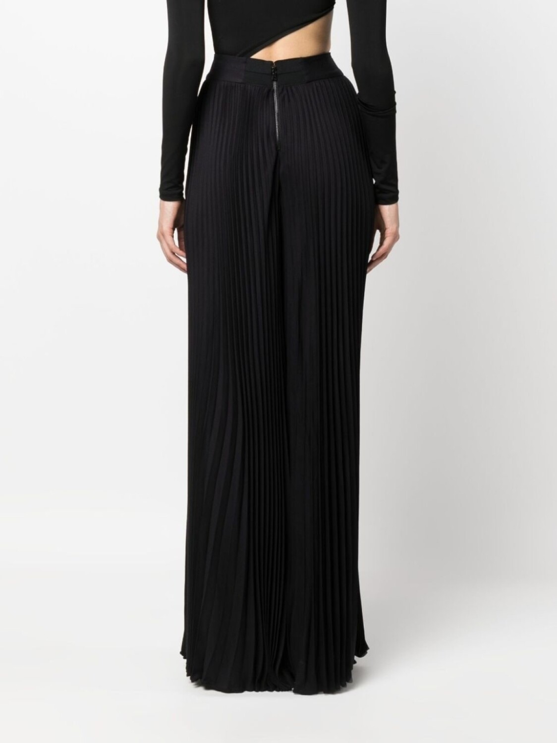 Черный, складки, застежка на молнии сзади, два вшитых кармана по бокам, завышенная талия, широкий крой и прямой подол.