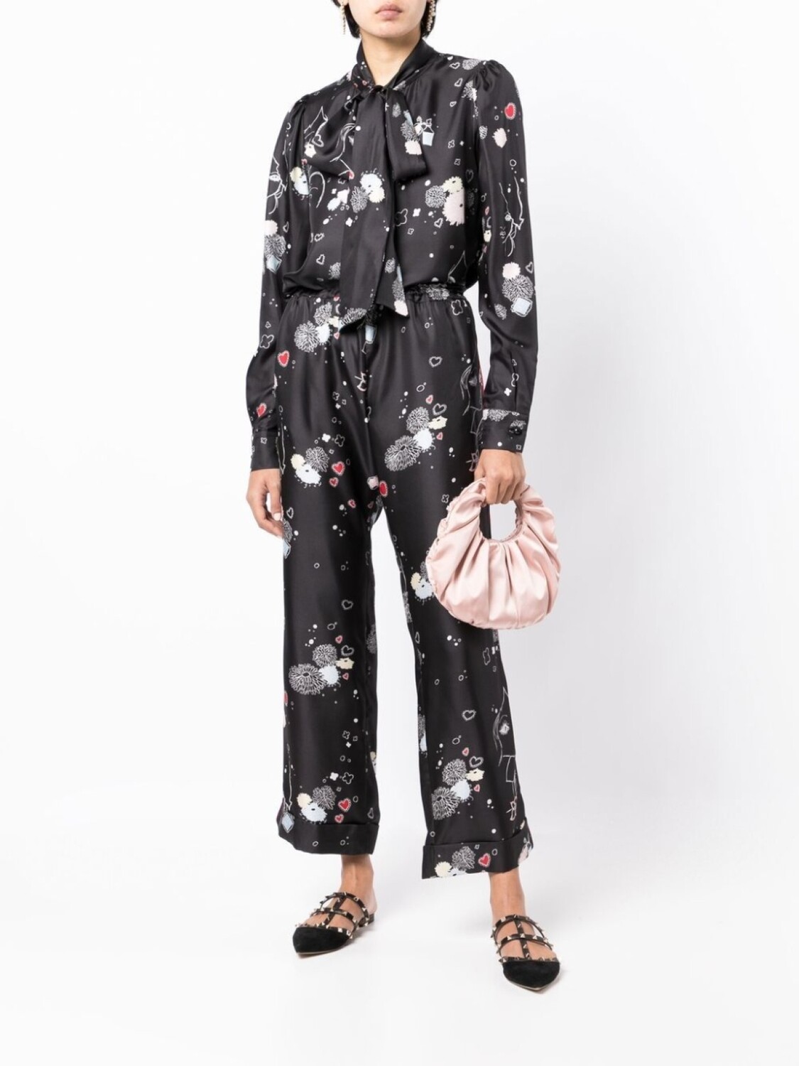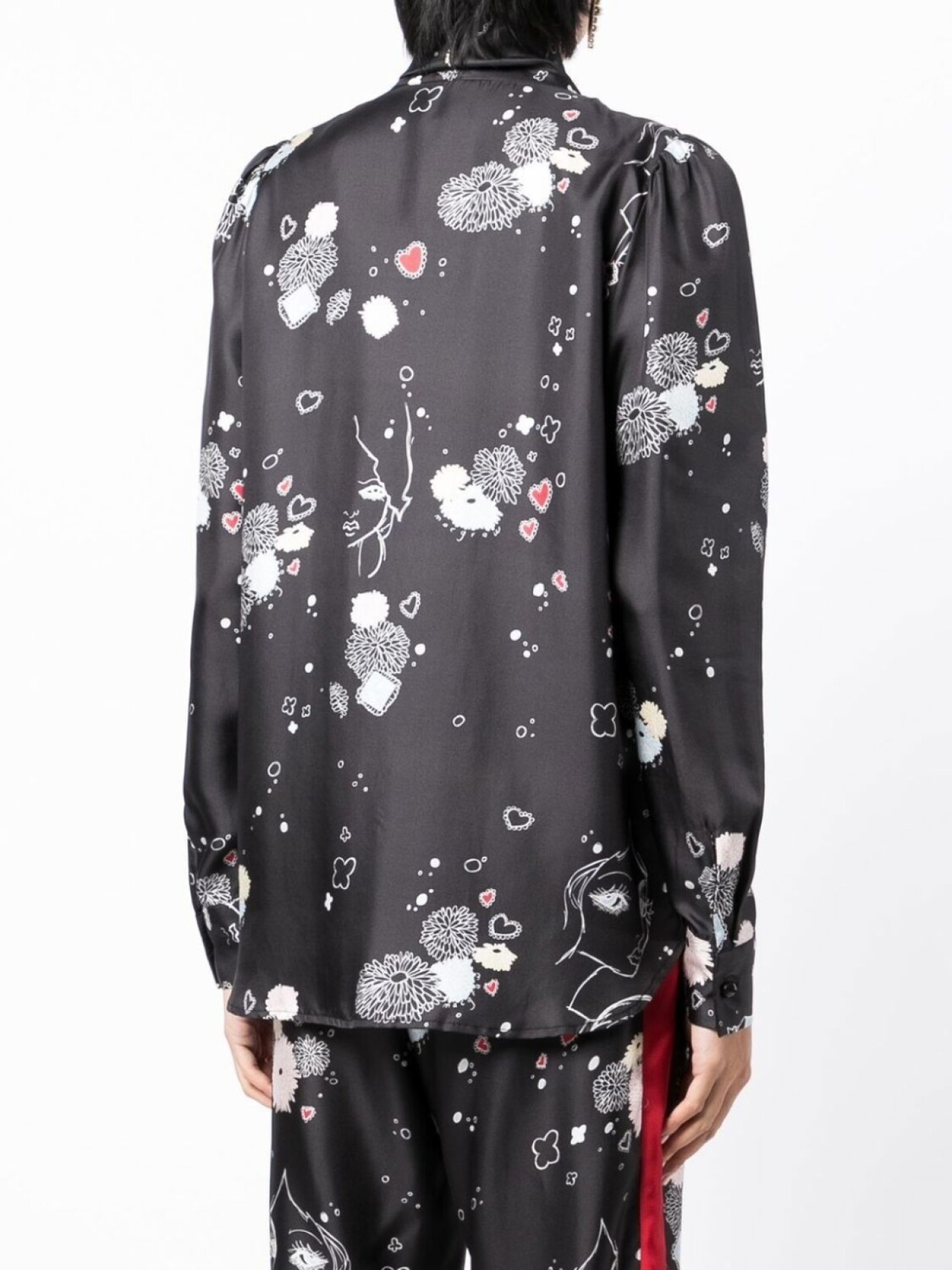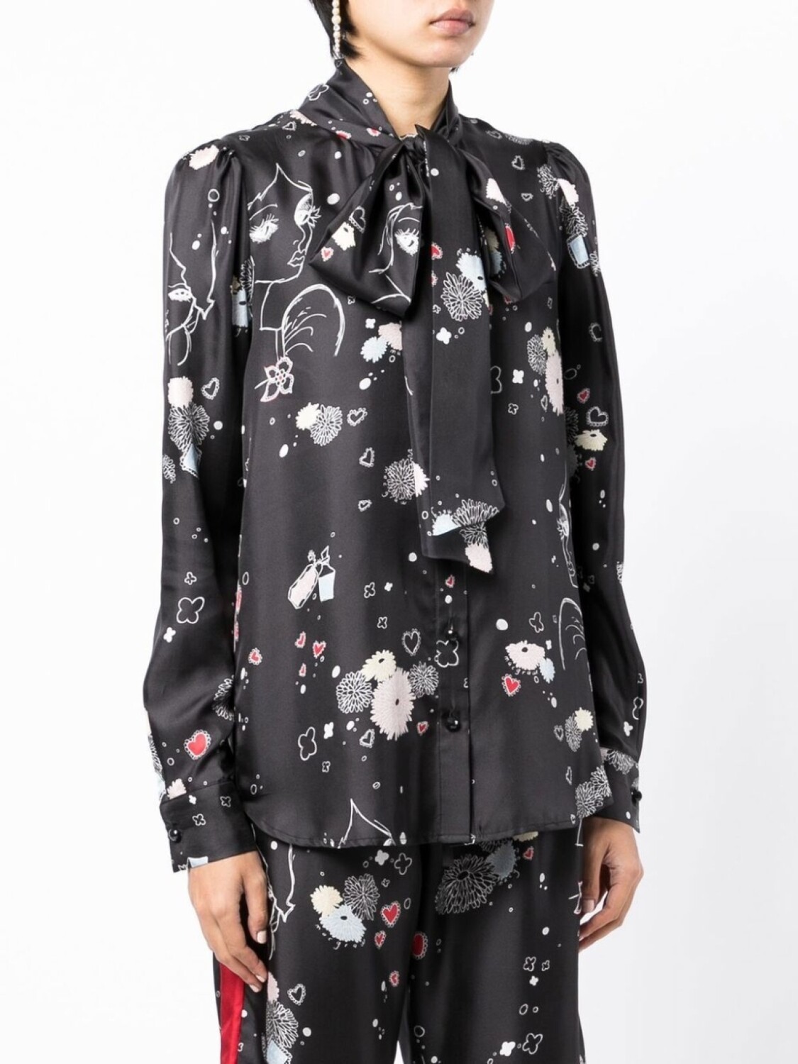 Черный/разноцветный, шелк, воротник с бантом, застежка на пуговицах спереди, длинные рукава, манжеты на пуговицах и закругленный подол.