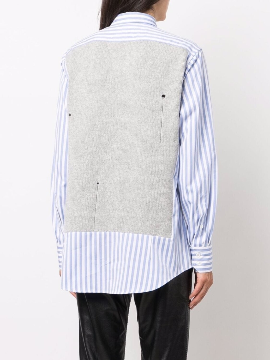 Многослойный дизайн, эффект потертости, узор в вертикальную полоску, трикотажный материал, классический воротник и длинные рукава.
