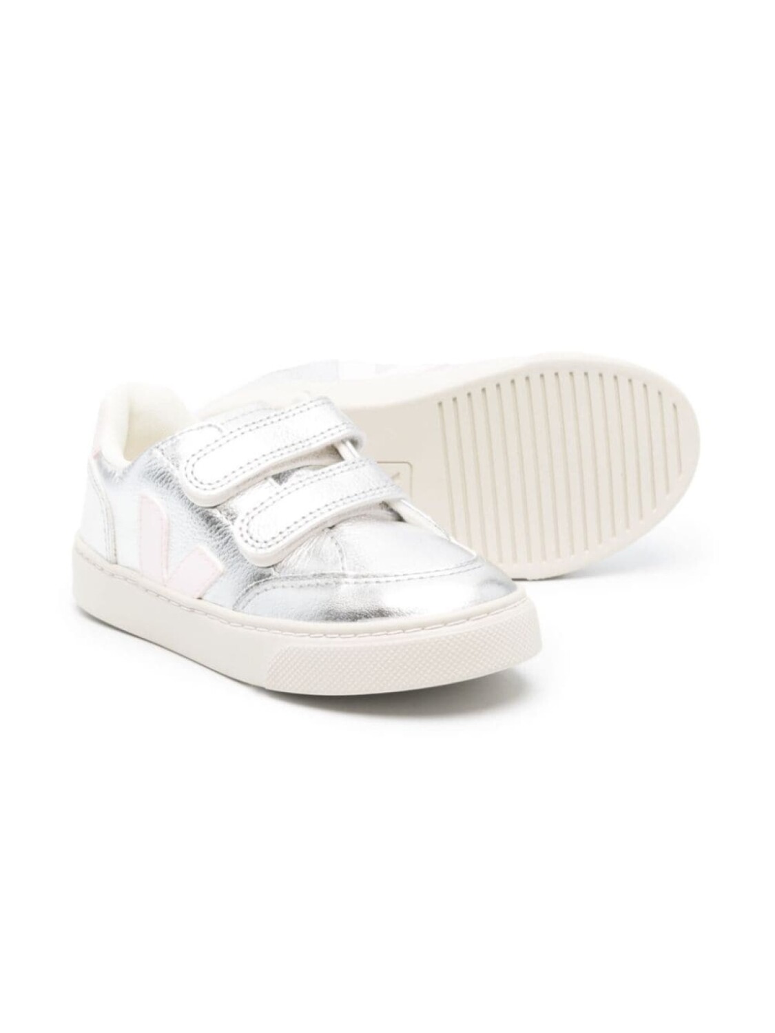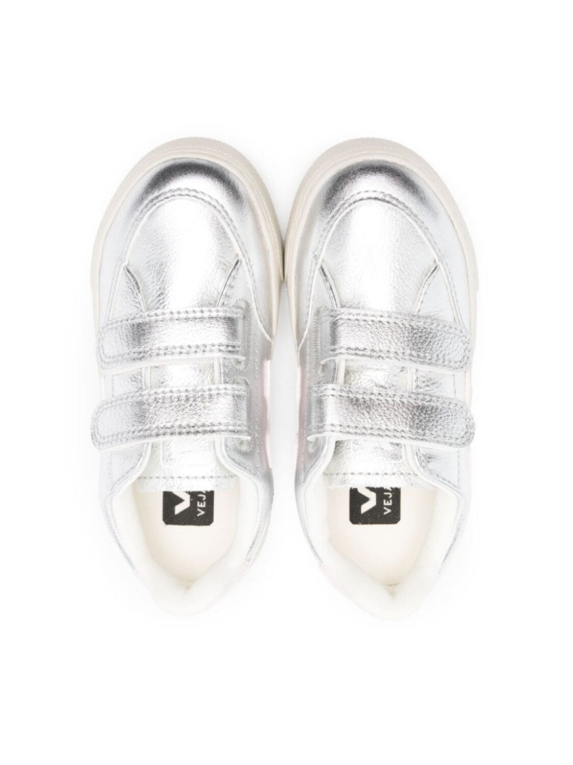 Подробнее о товаре: Серебристый, светло-розовый, телячья кожа, зернистая текстура, эффект металлик, нашивка с логотипом сбоку, язычок с логотипом, контрастный задник с логотипом, закругленный носок, застежка на липучке спереди, стелька с логотипом и плоская резиновая подошва. Узнать больше о том, какие товары получают отметку «Ответственный выбор», можно из материала «Как мы оцениваем экологичность и этичность».