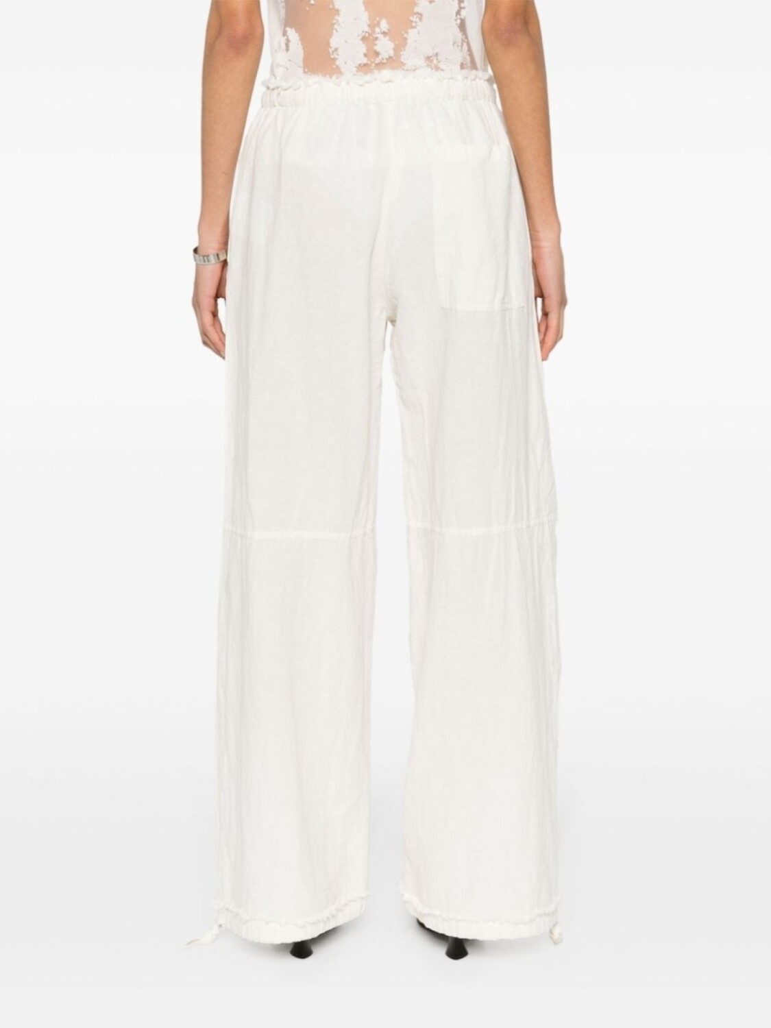 Белый, смесь хлопка и льна, эластичный пояс на шнурке, два прорезных кармана по бокам, декоративные швы, манжеты с кулиской, накладной карман сзади