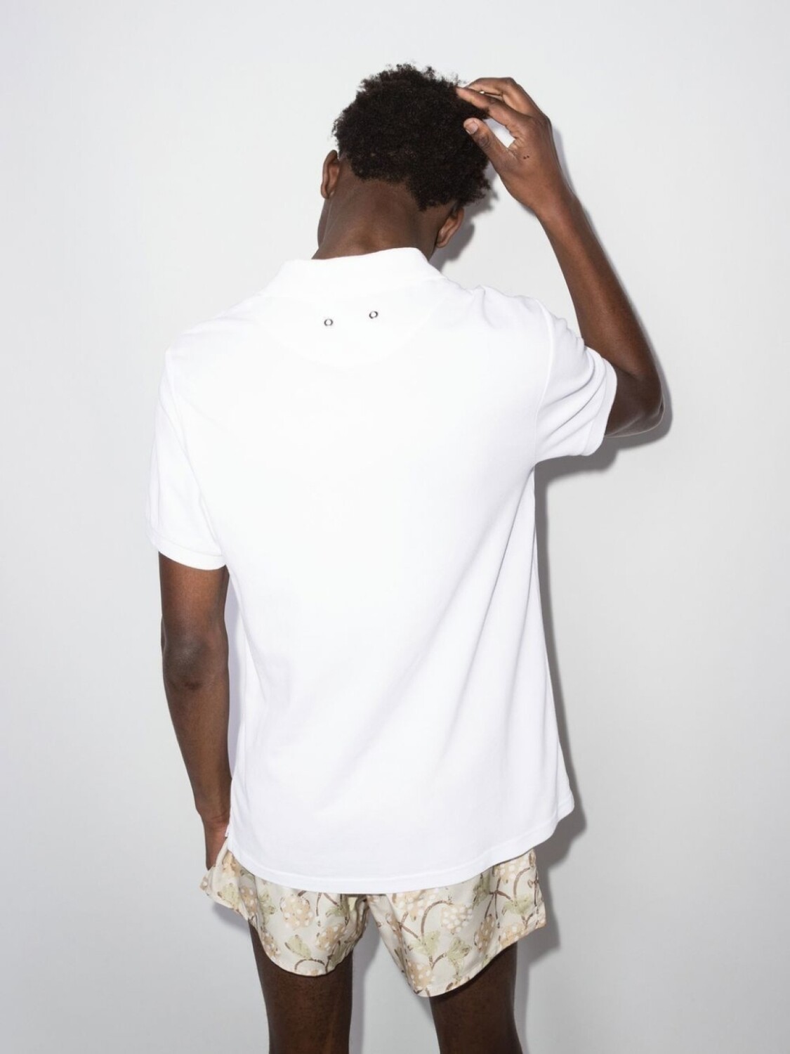 Воротник поло, вышитый логотип, прямой подол, боковые разрезы, короткие рукава и отделка металлическими люверсами. Цвет: белый.