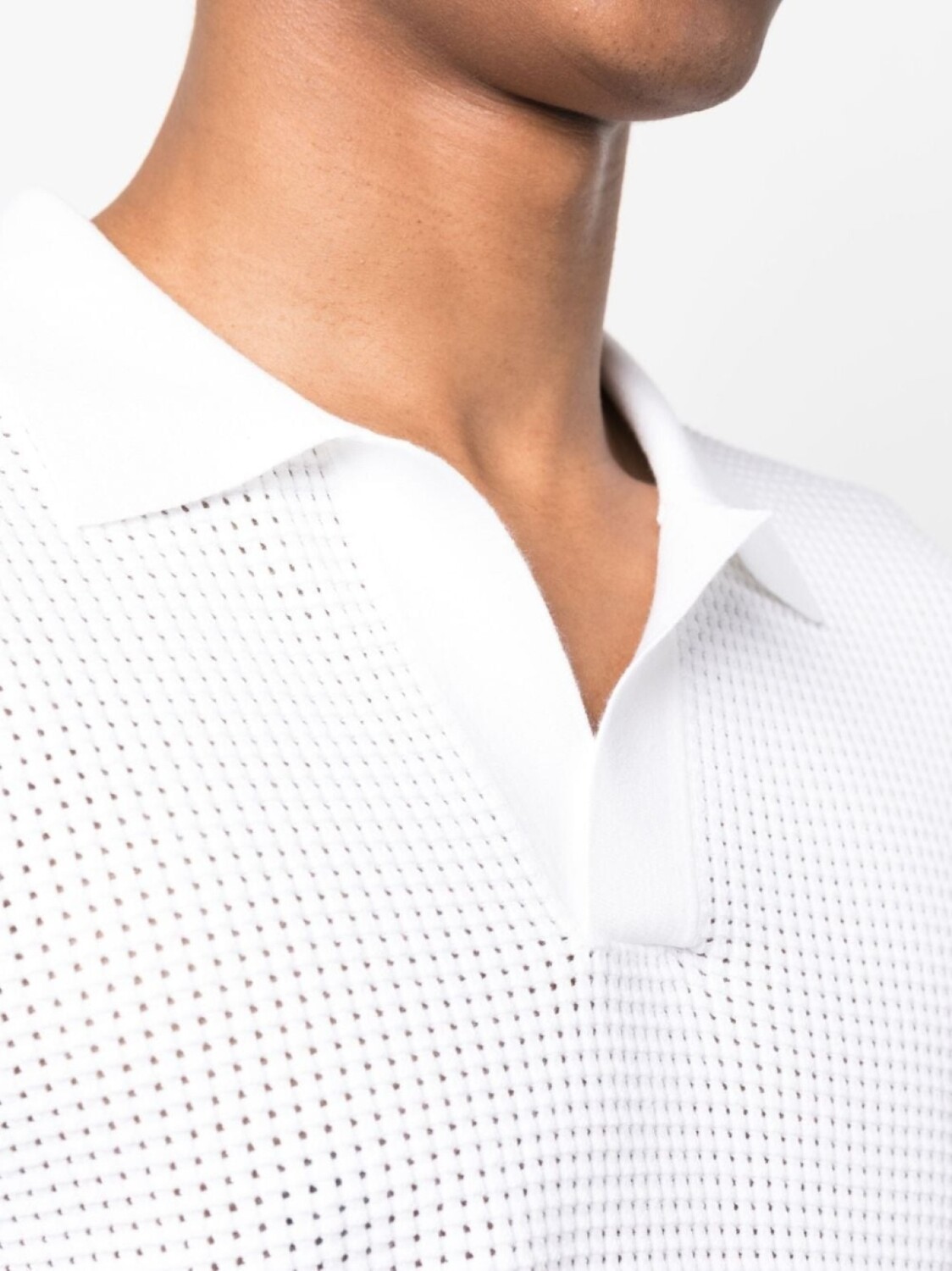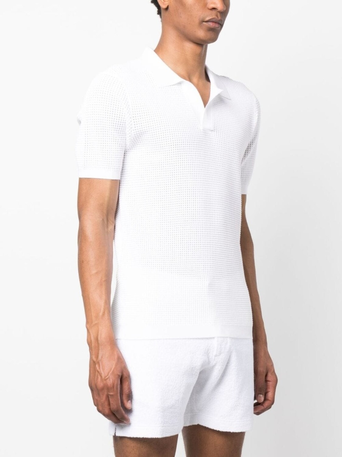 Белый, перфорированная модель, воротник поло, V-образный вырез, короткие рукава и прямой подол.