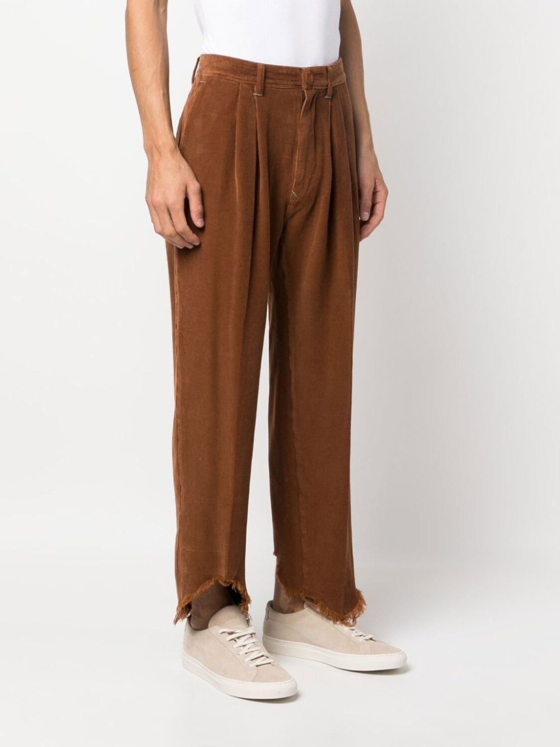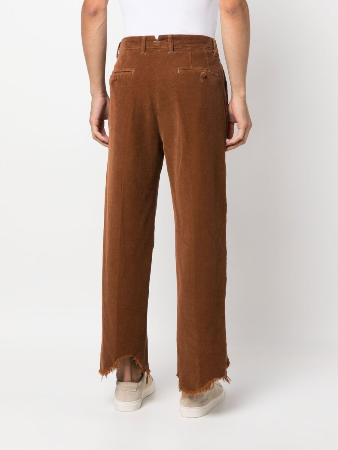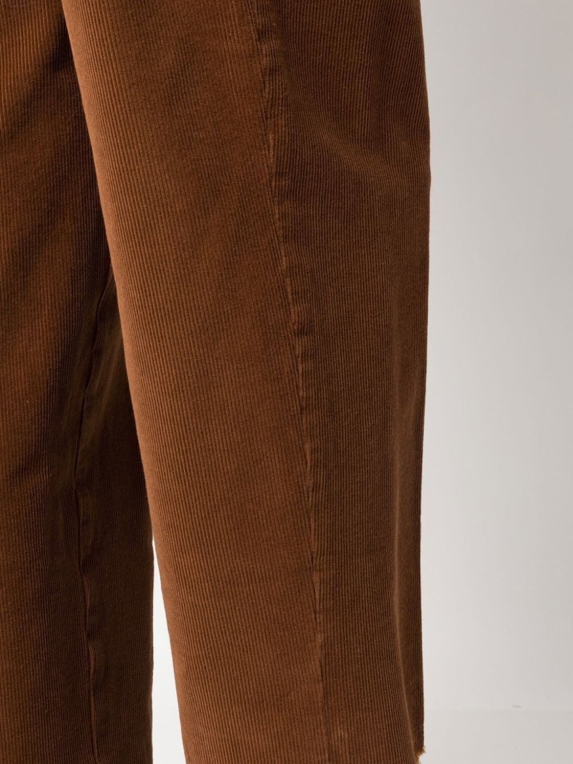 Коричневый, хлопок, вельветовый материал, необработанные края, прямой крой, застежка на молнии и пуговице спереди и петли для ремня.