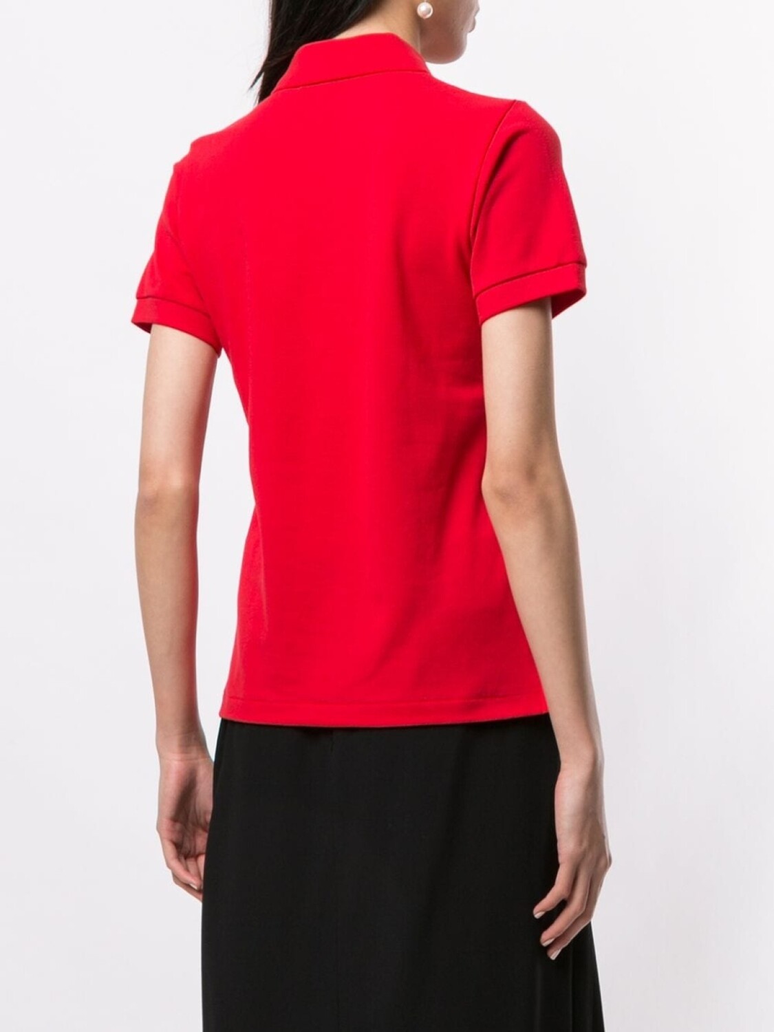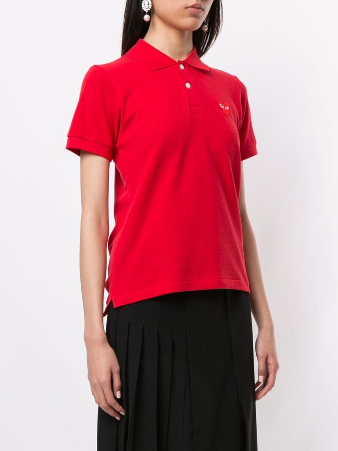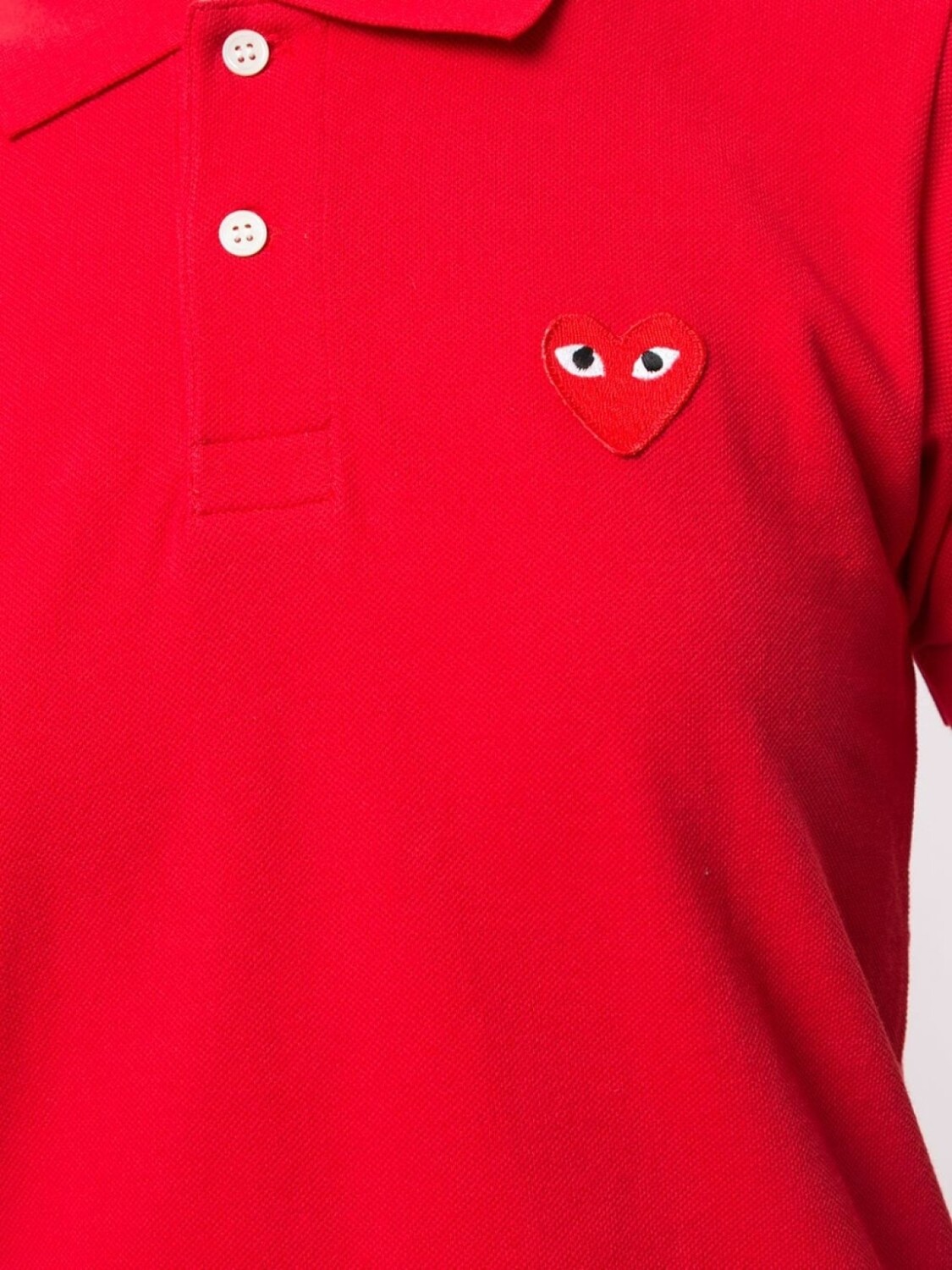 Рубашка поло из ткани пике от Comme des Garçons Play. Косой воротник, планка на пуговицах спереди, контрастный вышитый логотип на груди, короткие рукава и прямой крой. Цвет: красный.