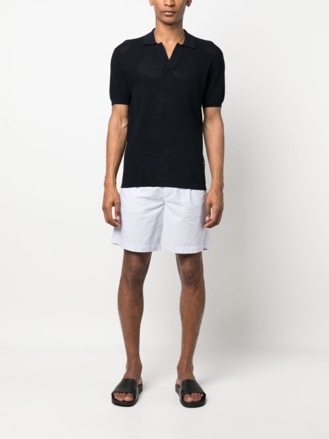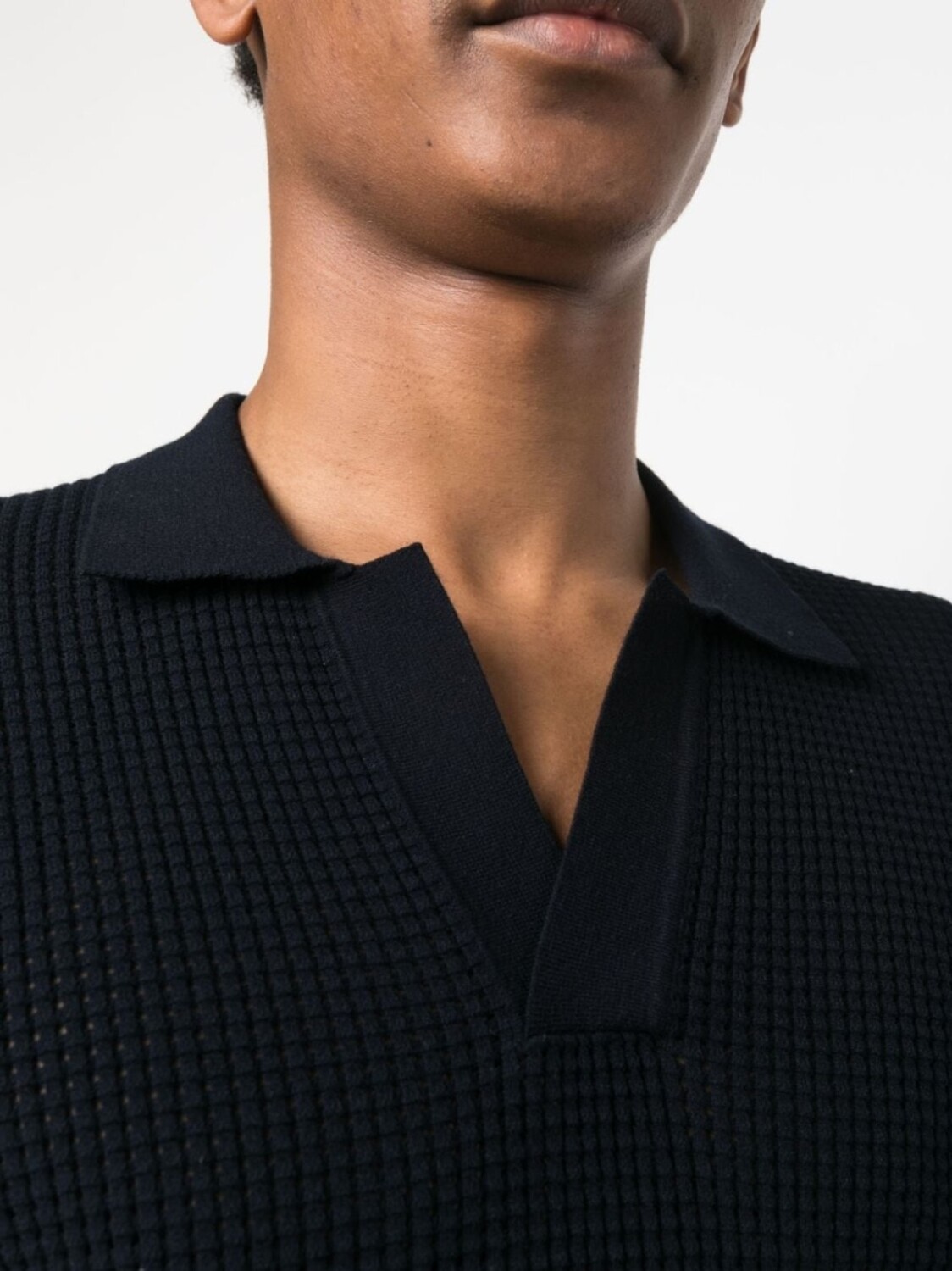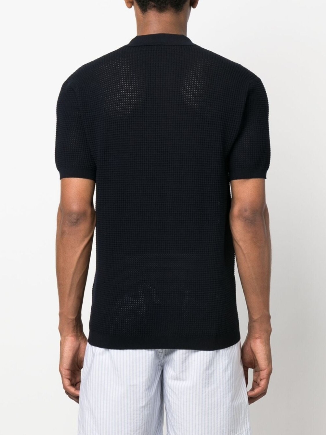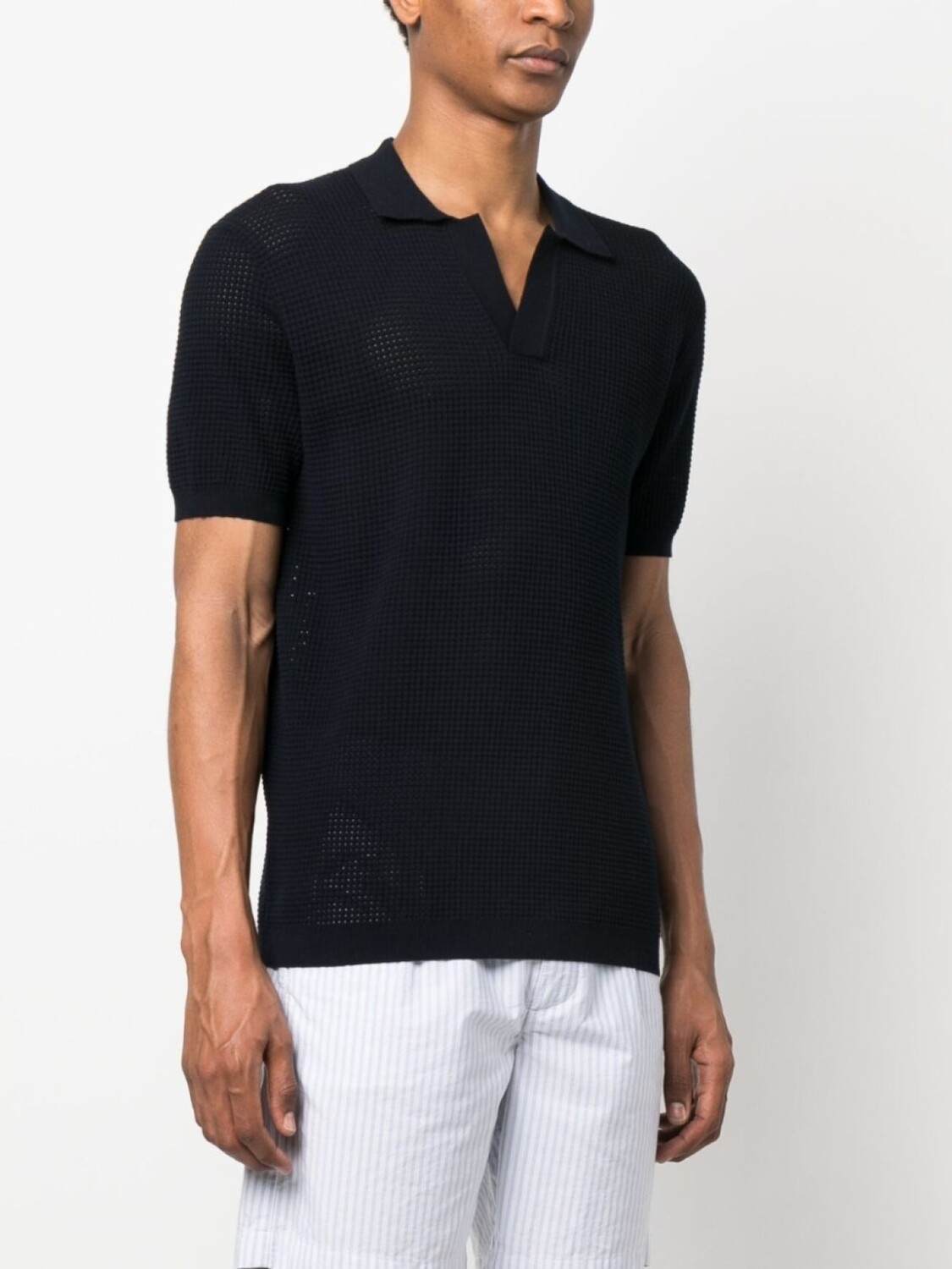Темно-синий, трикотажный материал, воротник поло, V-образный вырез, короткие рукава и прямой подол.