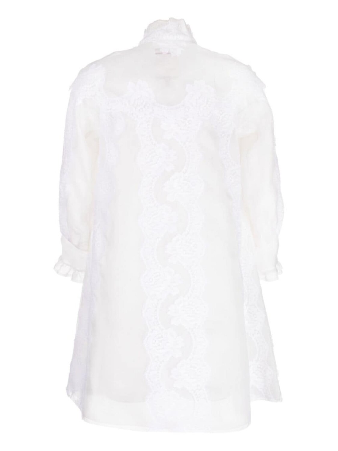 Белый, шелк малбери, органза, прозрачные кружевные вставки, воротник с оборками, застежка на пуговицах спереди, длинные рукава, манжеты с оборками и длина до бедер.