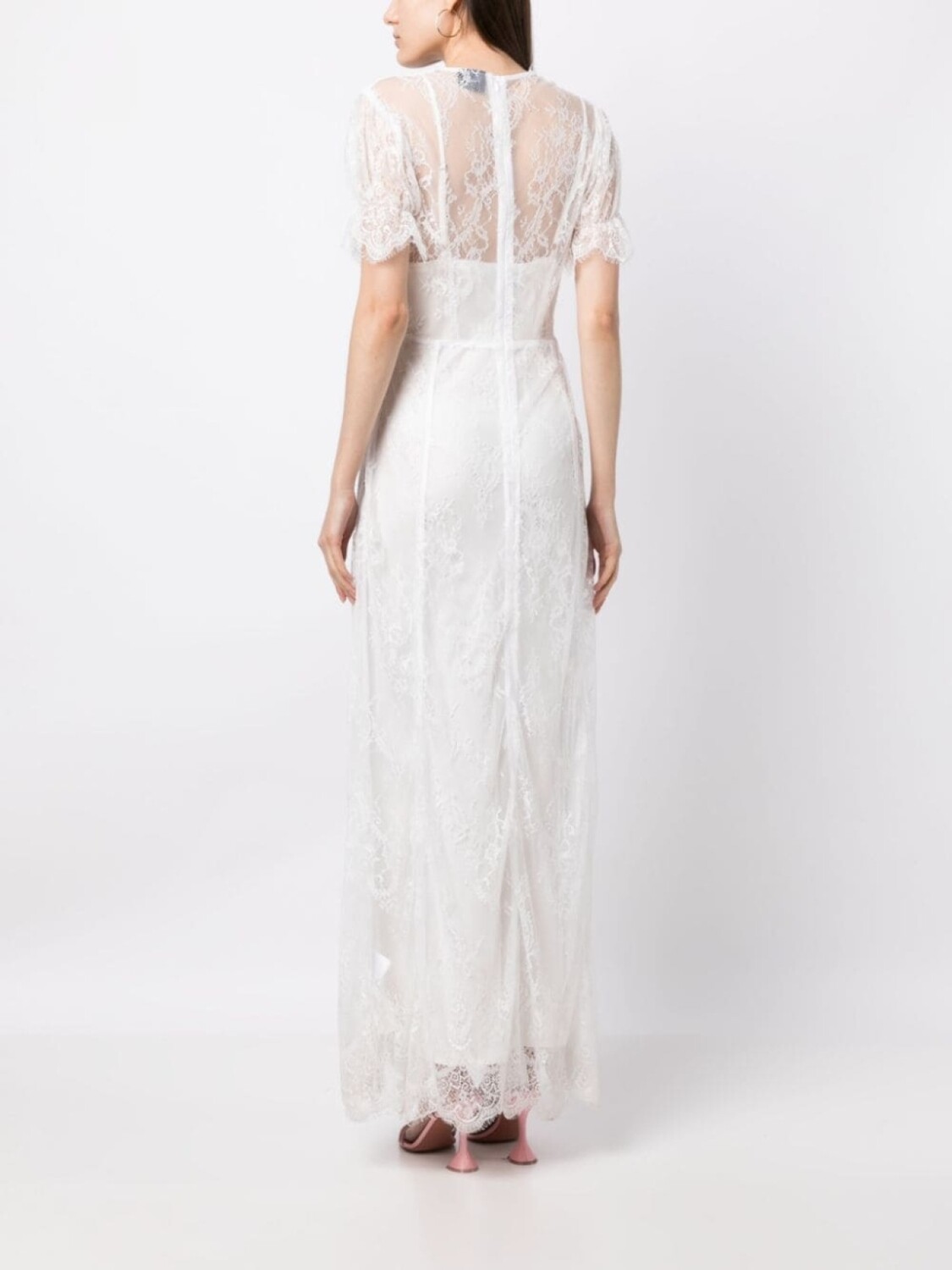 Серовато-белый, шелк, гипюровое кружево, полупрозрачный дизайн, расклешенный крой, дизайн со сборками, проклеенные швы, глубокий V-образный вырез, потайная застежка на молнии сзади, короткие рукава, длина макси и частичная подкладка.