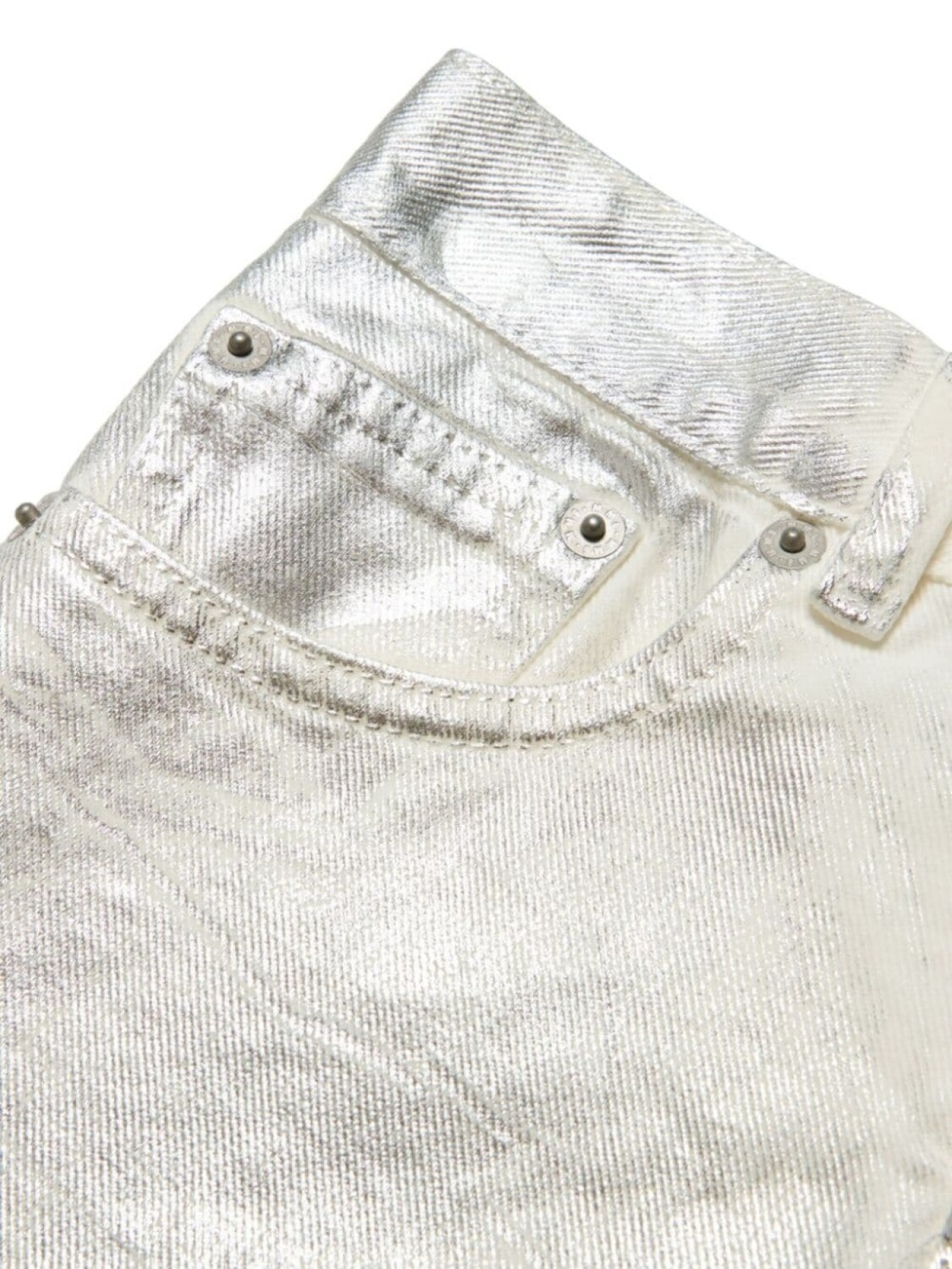 Молочно-белый, хлопок, эффект металлик, металл с покрытием, нашивка с логотипом сзади, застежка на молнии и пуговице спереди, эластичный пояс сзади, пять карманов и необработанный подол.