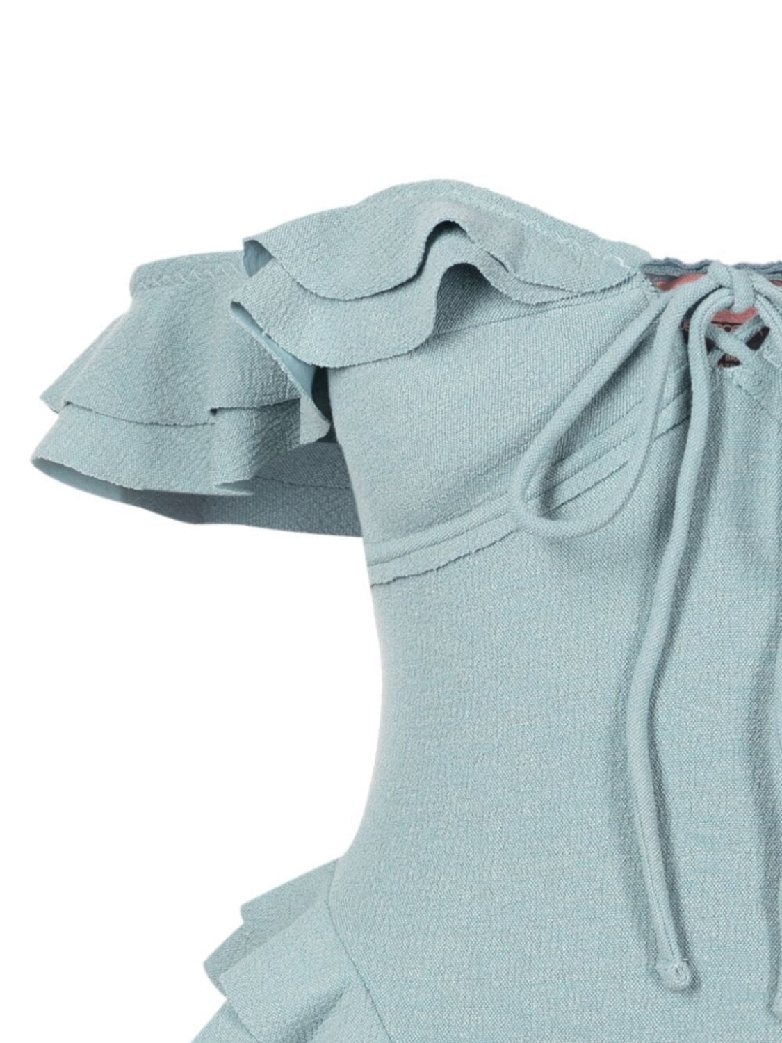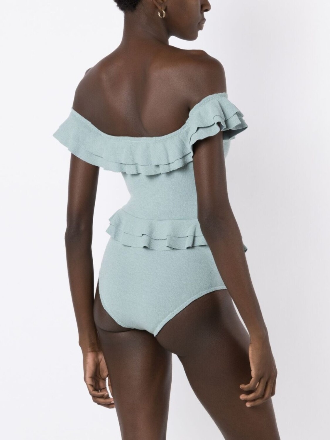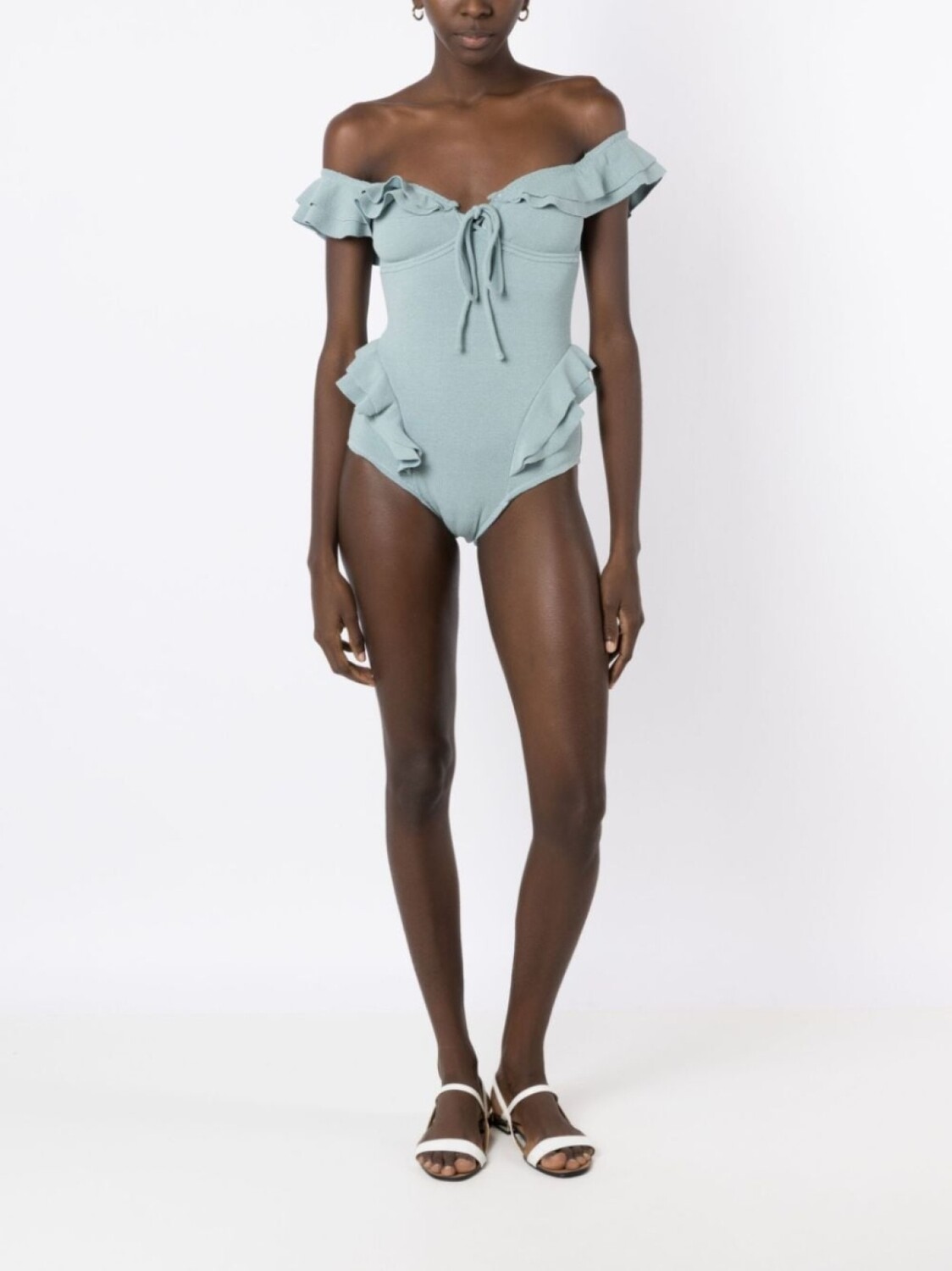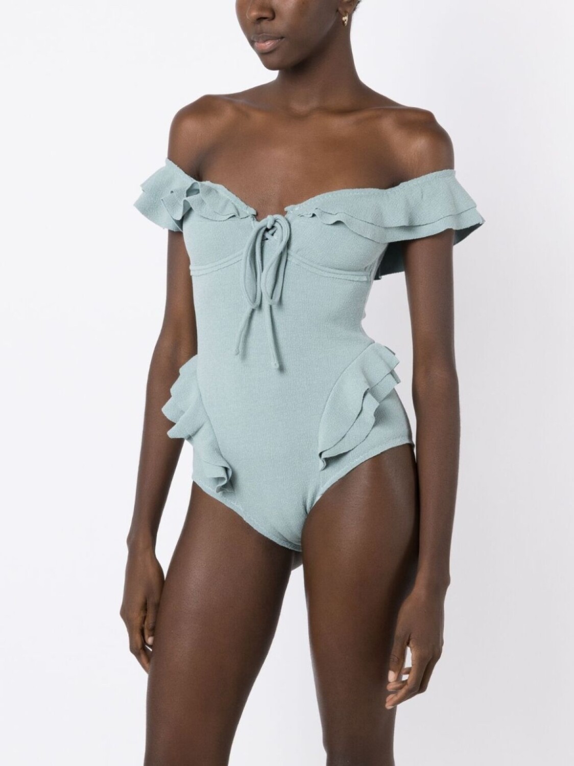 Вставки с оборками, открытые плечи и завязки спереди. Пожалуйста, примеряйте купальники и пляжные шорты только поверх собственного белья.