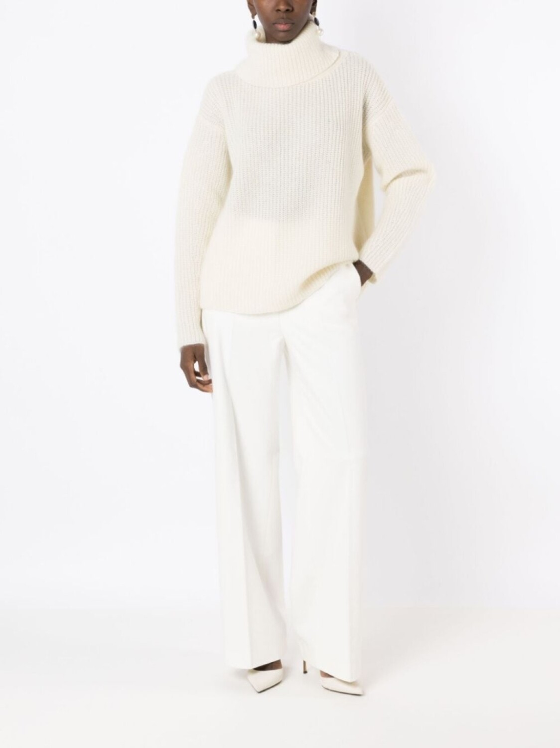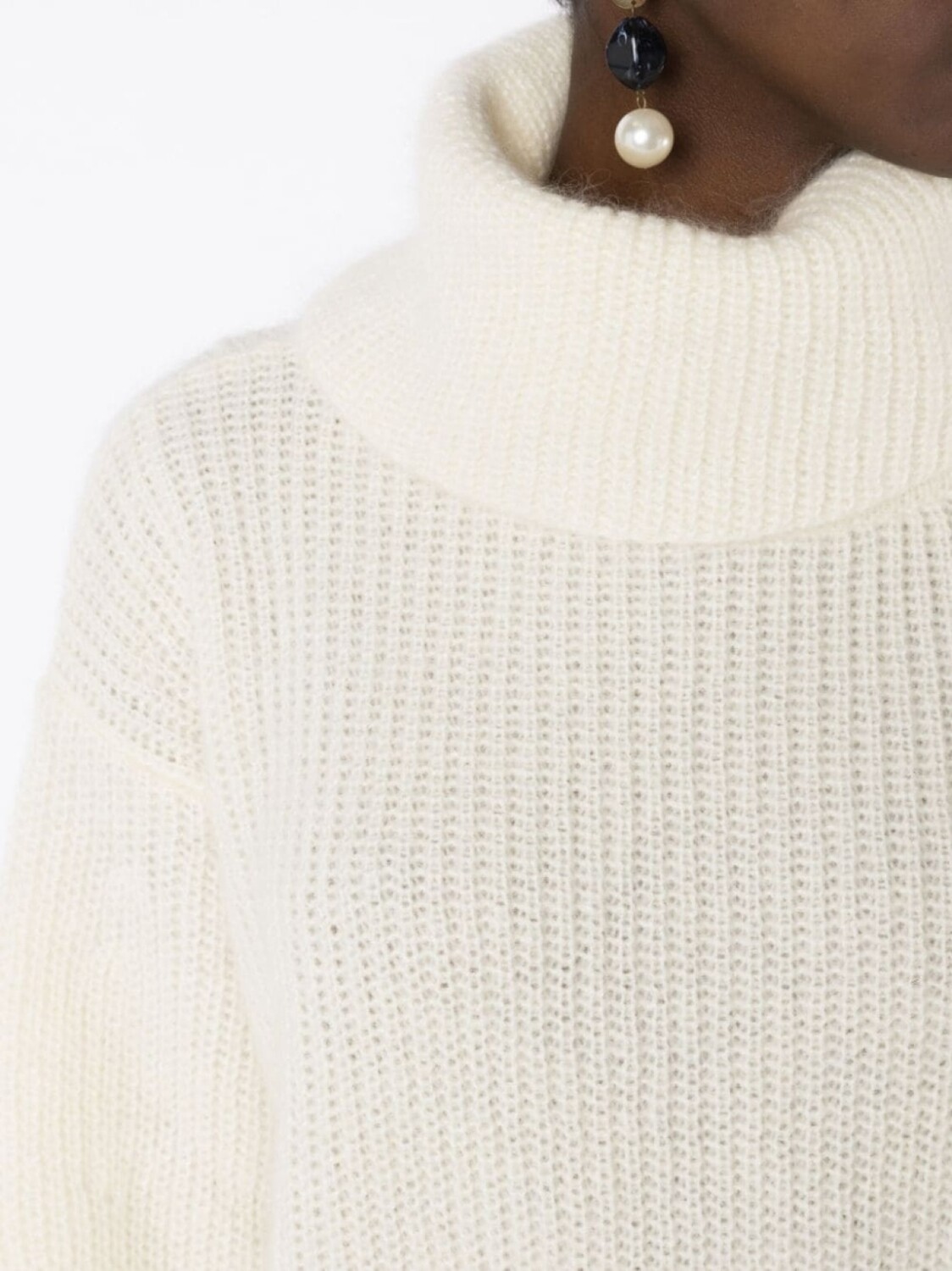 Кремово-белый, смесовый мохер, крупная вязка, высокий воротник, длинные рукава и прямой подол.