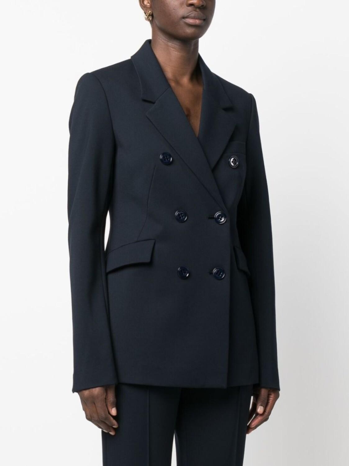Темно-синий, V-образный вырез, зазубренные лацканы, двубортная застежка на кнопки, два передних кармана с клапанами, длинные рукава, рукава с манжетами на пуговицах, вырез сзади и прямой подол.
