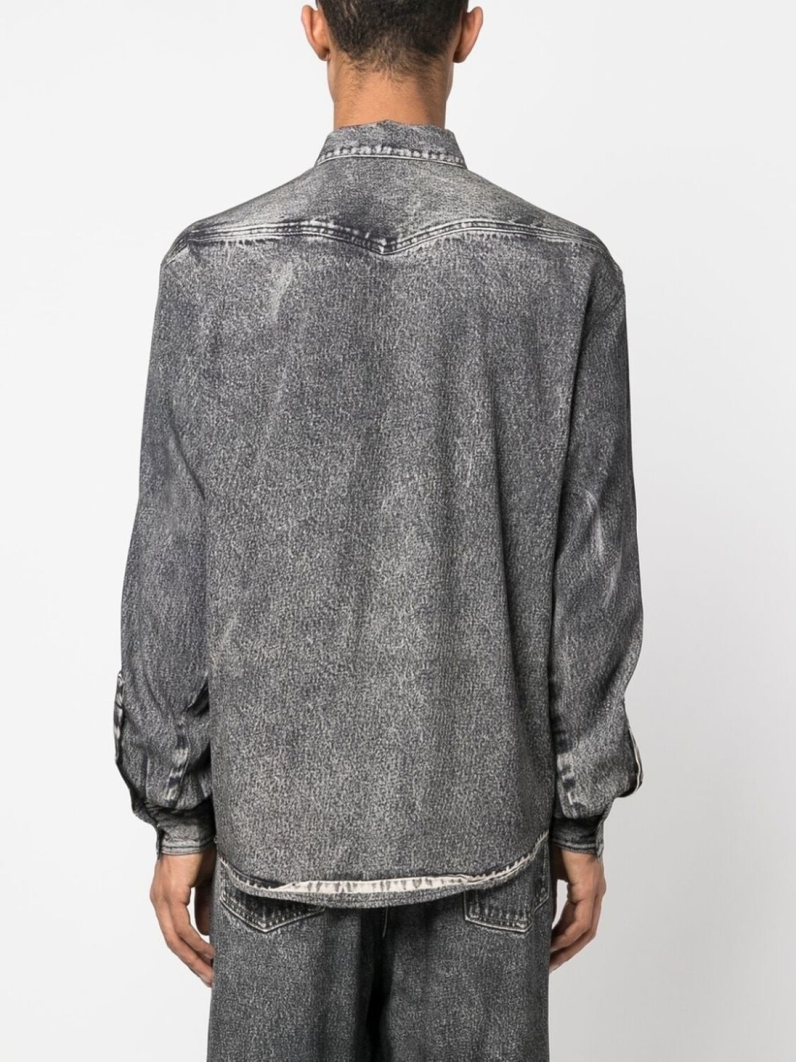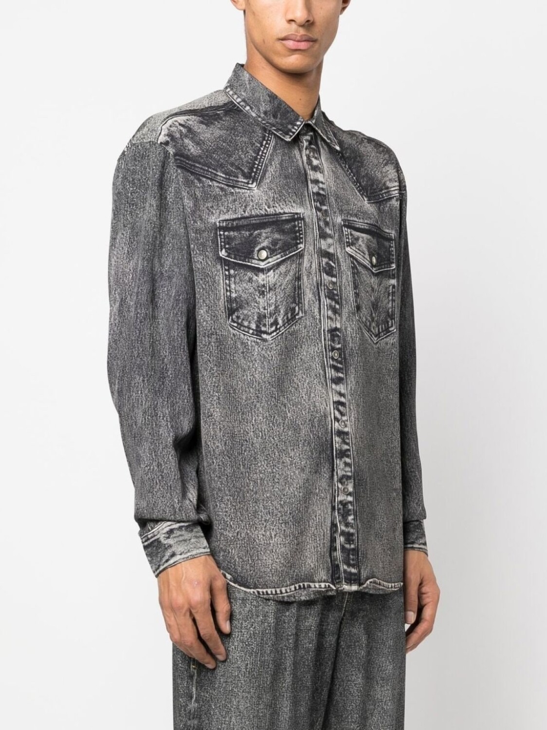 Черный, эффект кислотной стирки, классический воротник, застежка на пуговицах спереди, длинные рукава, манжеты на пуговицах, два накладных кармана на груди и закругленный подол.