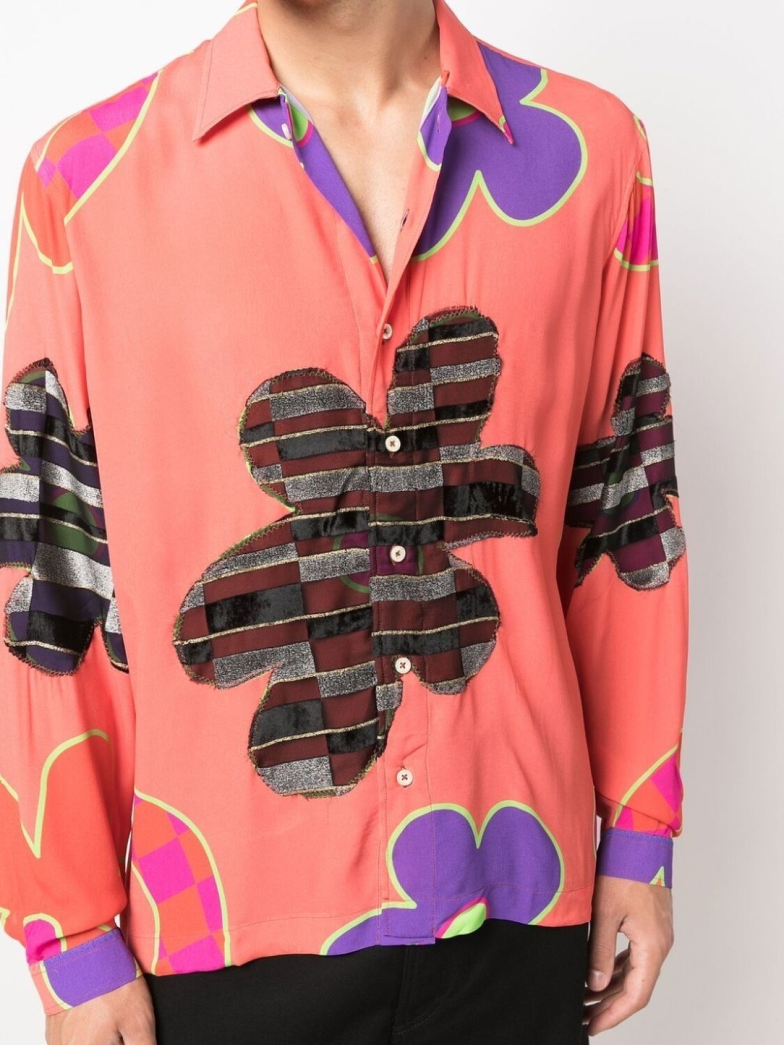 Расцветка Clay Orange, разноцветный, смесовый шелк, сплошной графичный принт, классический воротник, застежка на пуговицах спереди и длинные рукава.