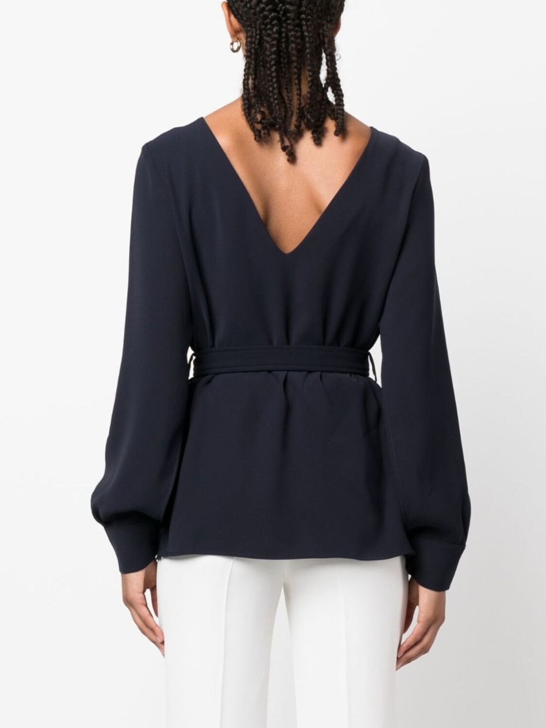Темно-синий, ремень на талии, вырез-лодочка, длинные рукава, V-образный вырез сзади и прямой подол.
