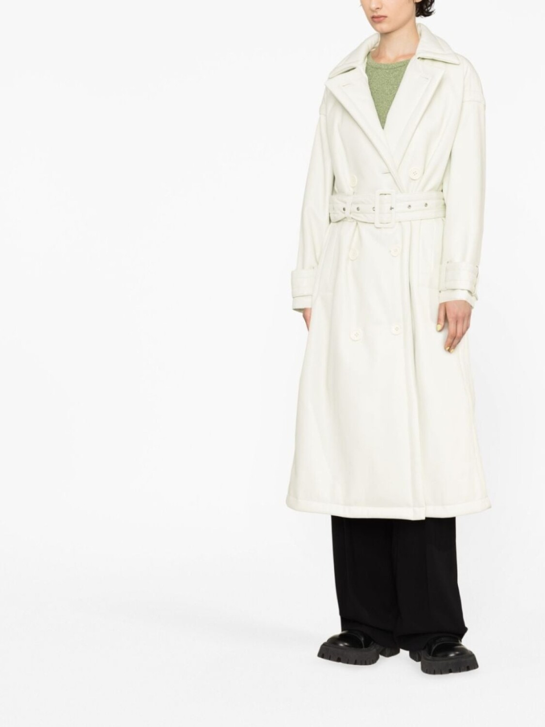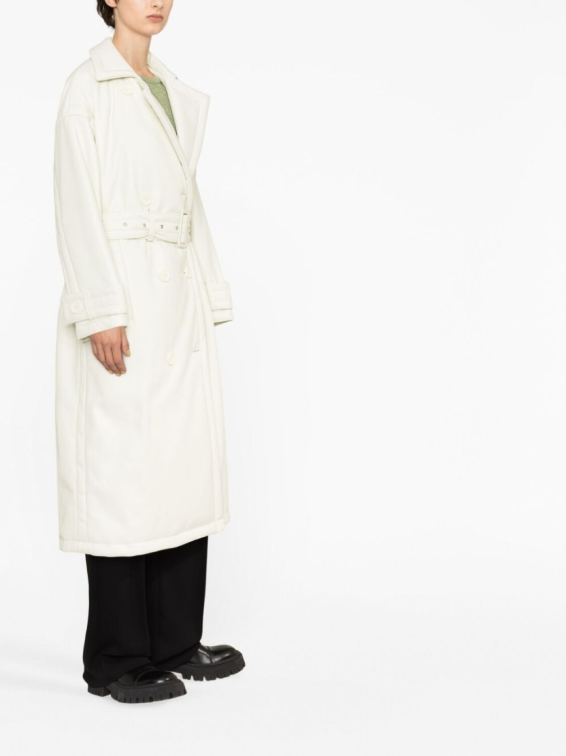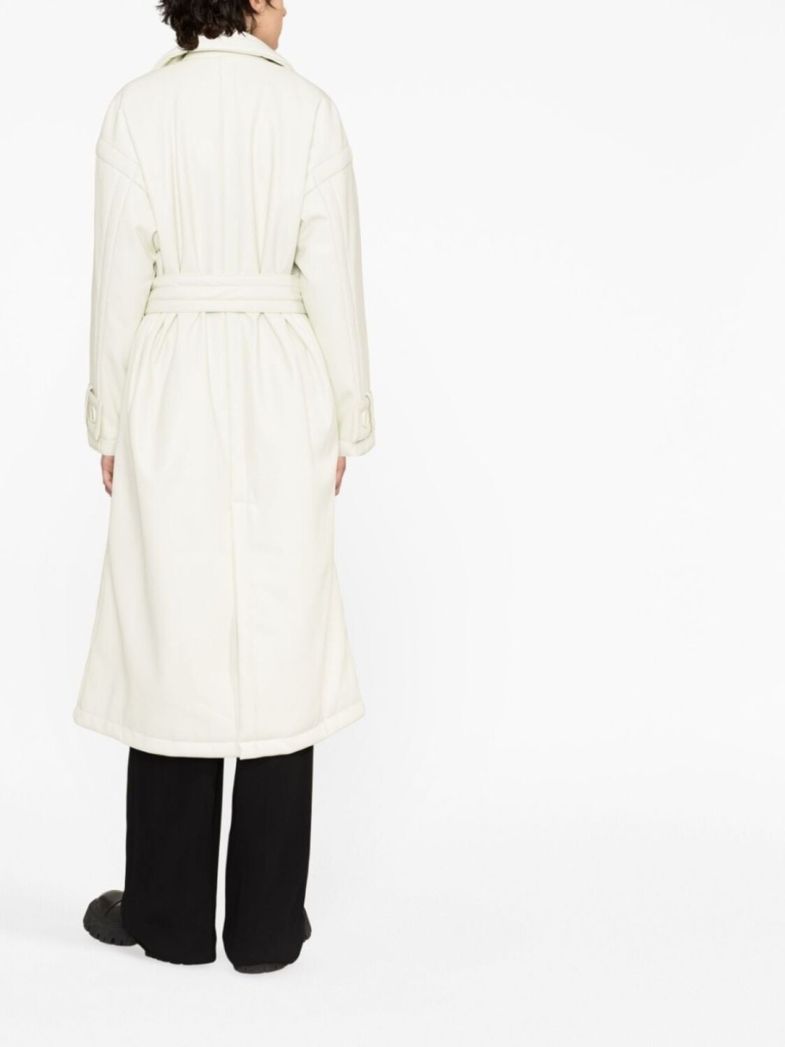 Белый, искусственная кожа, отложной воротник, двубортная застежка на кнопки, ремень на талии, длинные рукава, манжеты с ремешками и прямой подол.