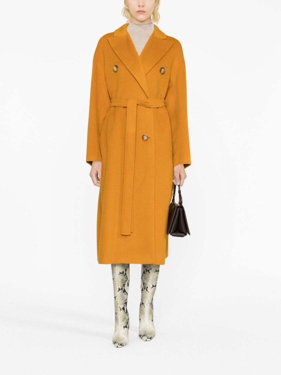 Желтая охра, смесь шерсти и кашемира, широкие заостренные лацканы, двубортная застежка на кнопки, ремень на талии, длинные рукава, прямой подол и длина миди.