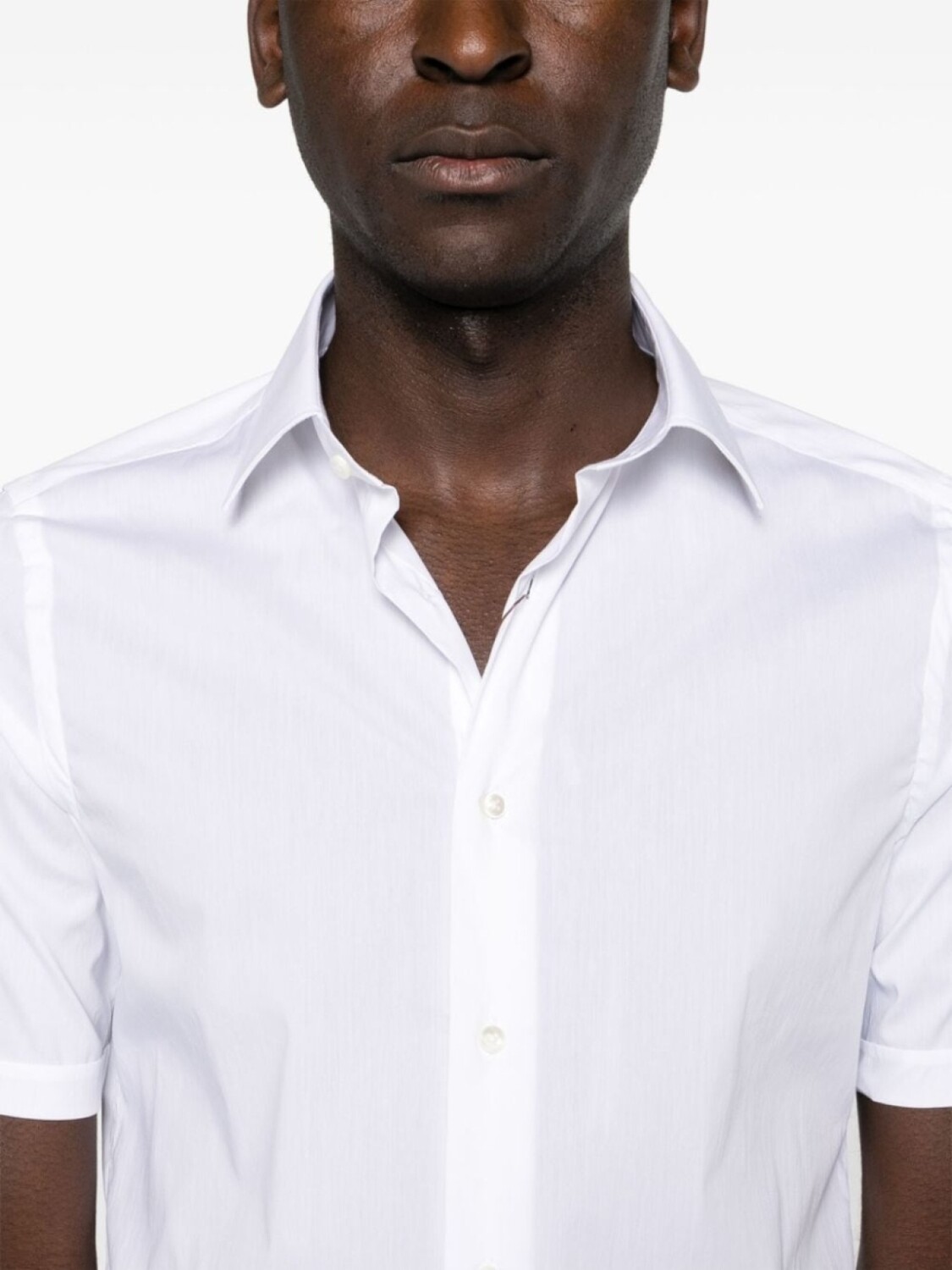 Белый, смесовый хлопок, поплин, защипы, классический воротник, застежка на пуговицах спереди, короткие рукава, закругленный подол