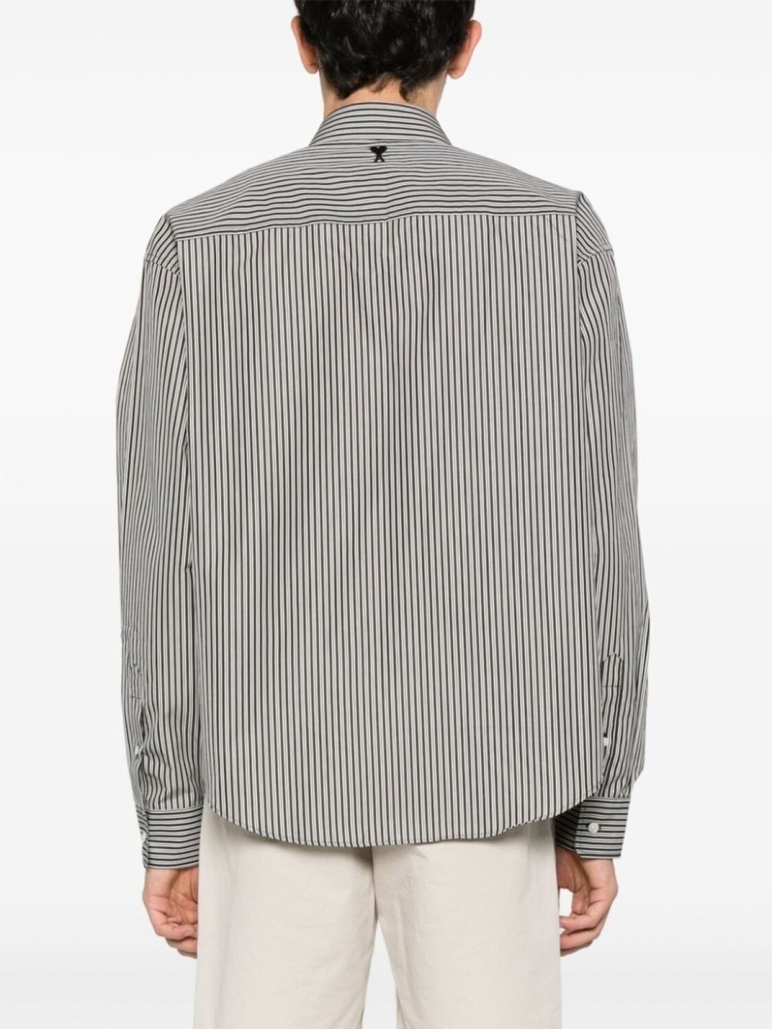Черный/белый, хлопок, узор в вертикальную полоску, плоский заостренный воротник, приспущенные плечи, длинные рукава с манжетами на пуговицах, нагрудный накладной карман, знаковая монограмма Ami de Coeur сзади, закругленный подол, застежка на пуговицах спереди