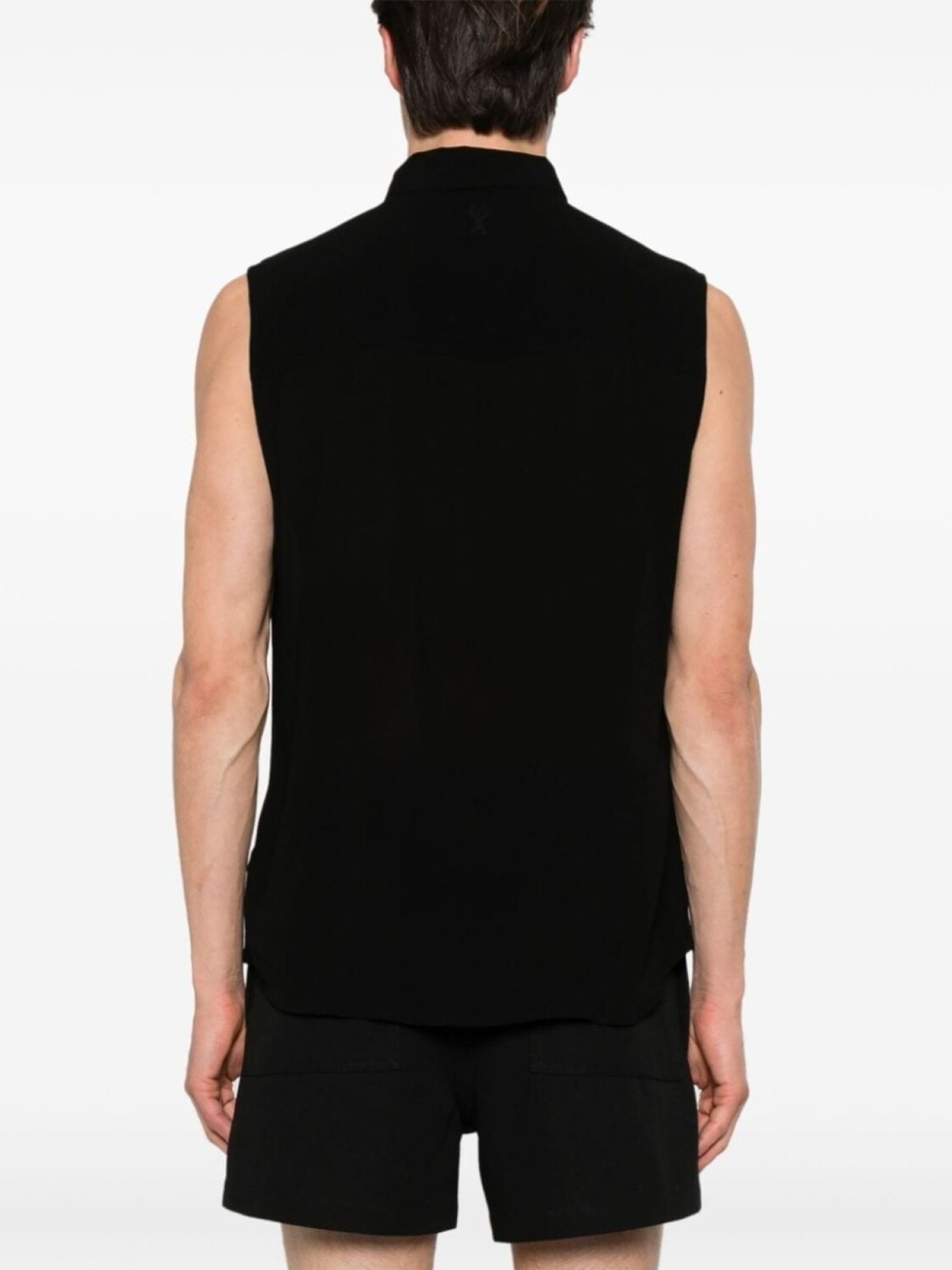 Черный, ткань креп-жоржет, полупрозрачный дизайн, жатый эффект, вышитая монограмма Ami de Coeur сзади, прямой воротник, глубокие проймы, без рукавов, закругленный подол, модель без подкладки, застежка на пуговицах спереди