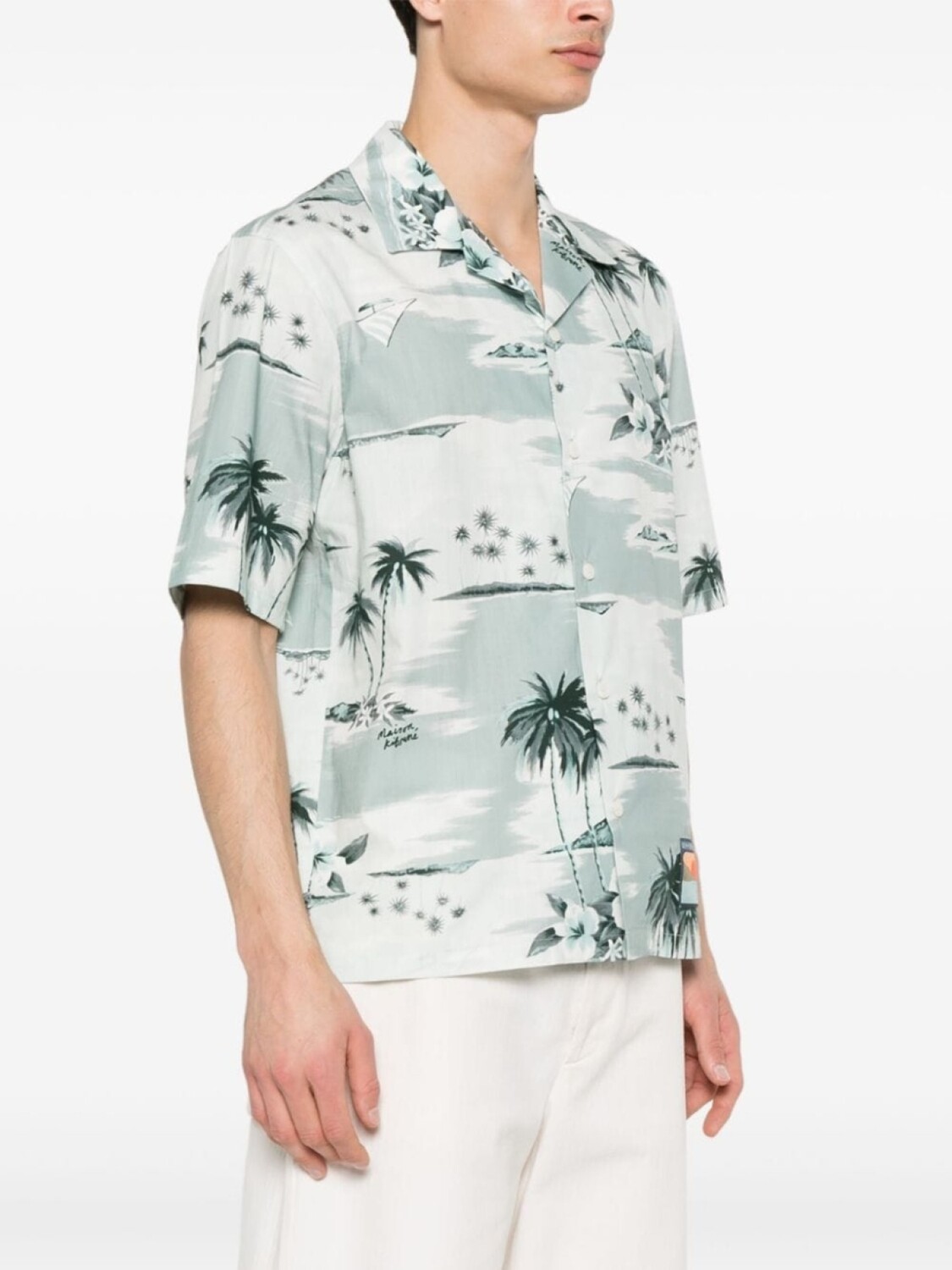 Бледный синий/голубой, хлопок, принт island, кубинский воротник, короткие рукава, бирка с логотипом, прямой подол, планка на пуговицах спереди