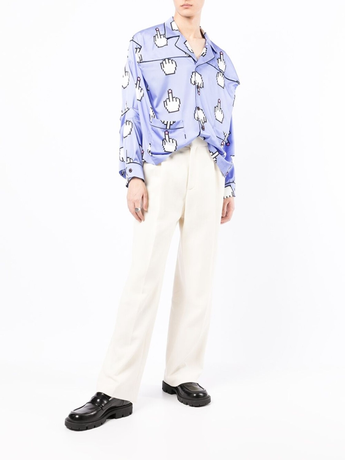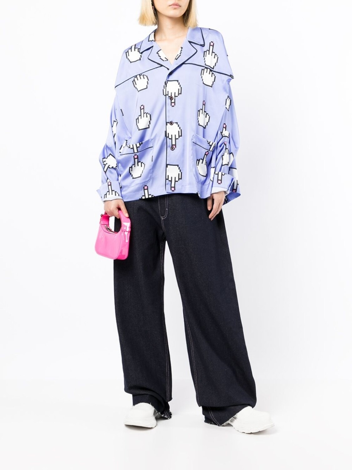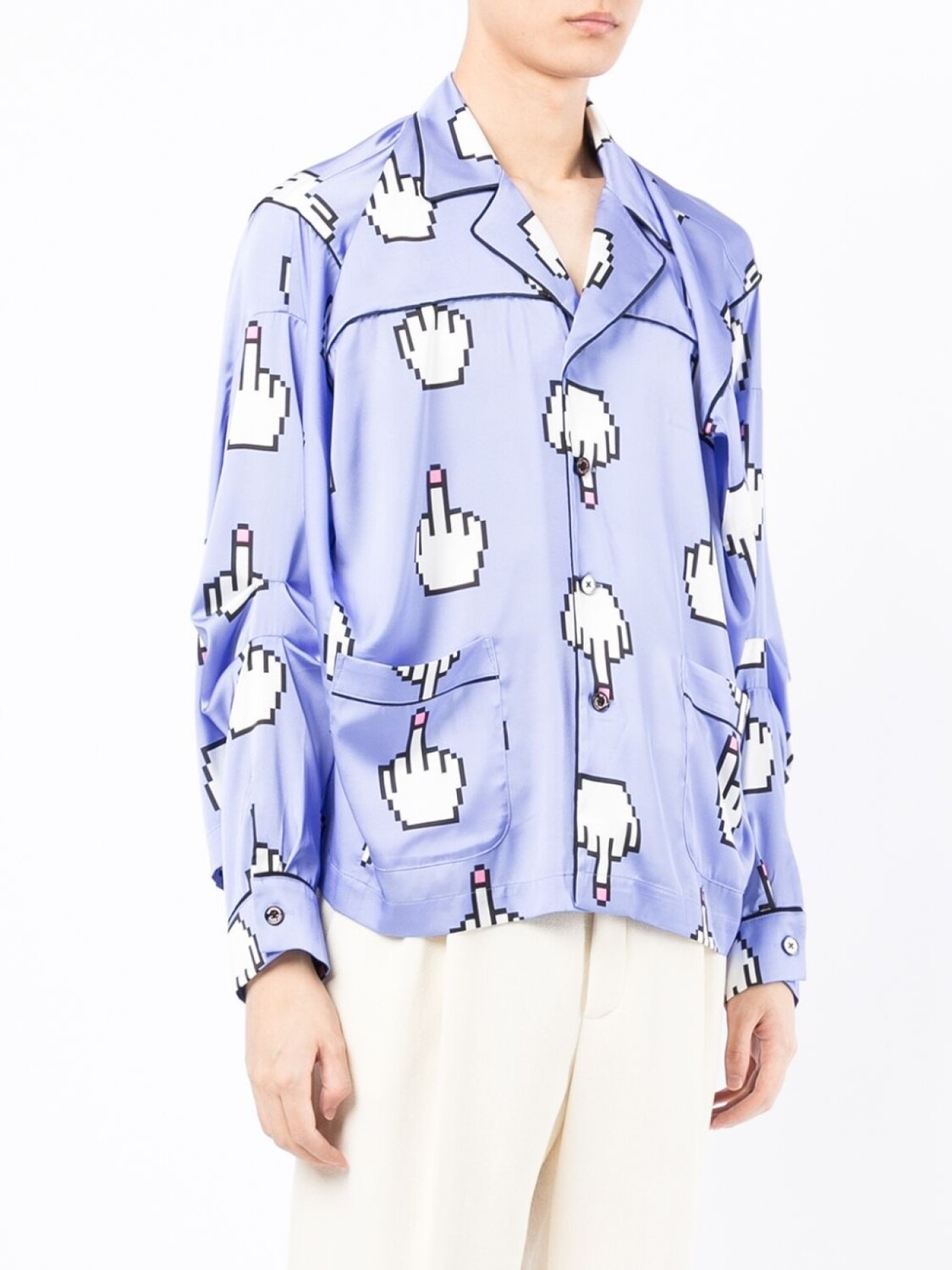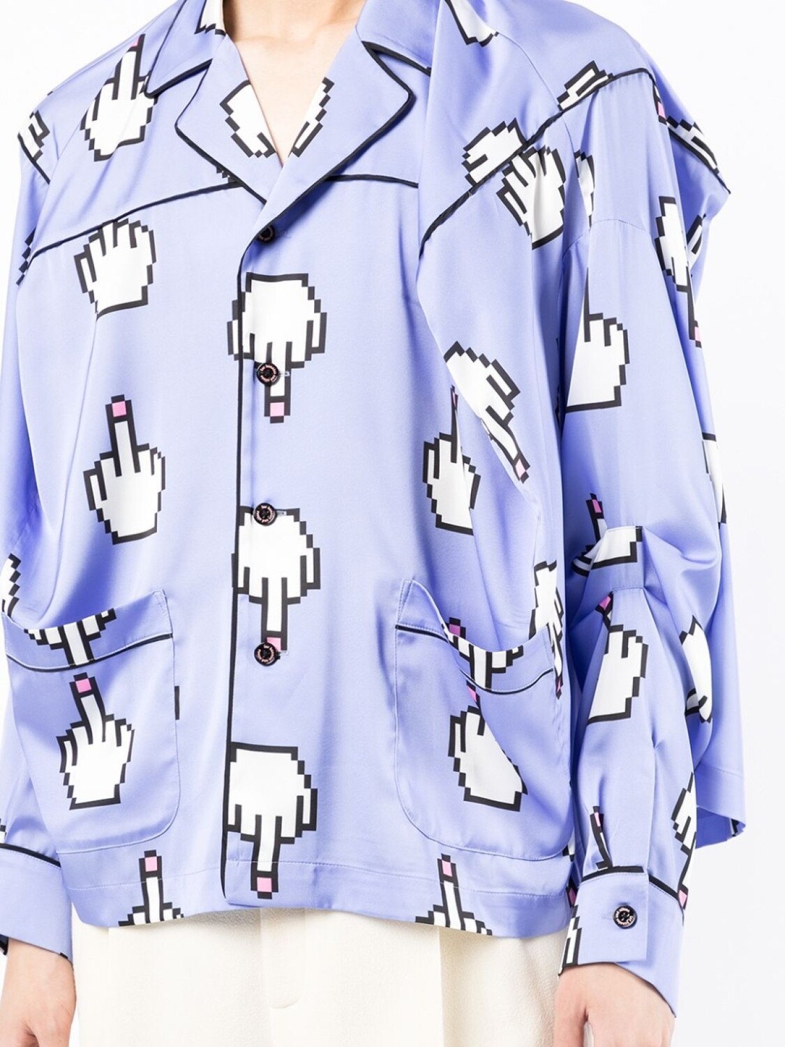 Сплошной графичный принт, застежка на пуговицах спереди, длинные рукава, прямой подол и два накладных кармана спереди.