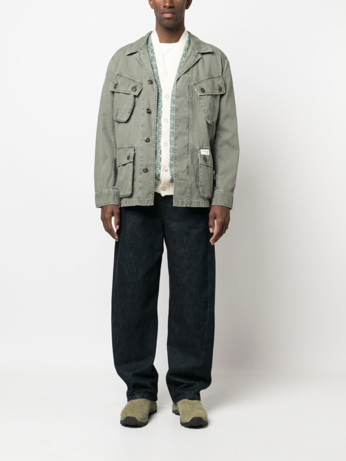 Хаки, хлопок, четыре накладных кармана спереди, нашивка с логотипом сбоку, застежка на пуговицах спереди, длинные рукава и зазубренный воротник.