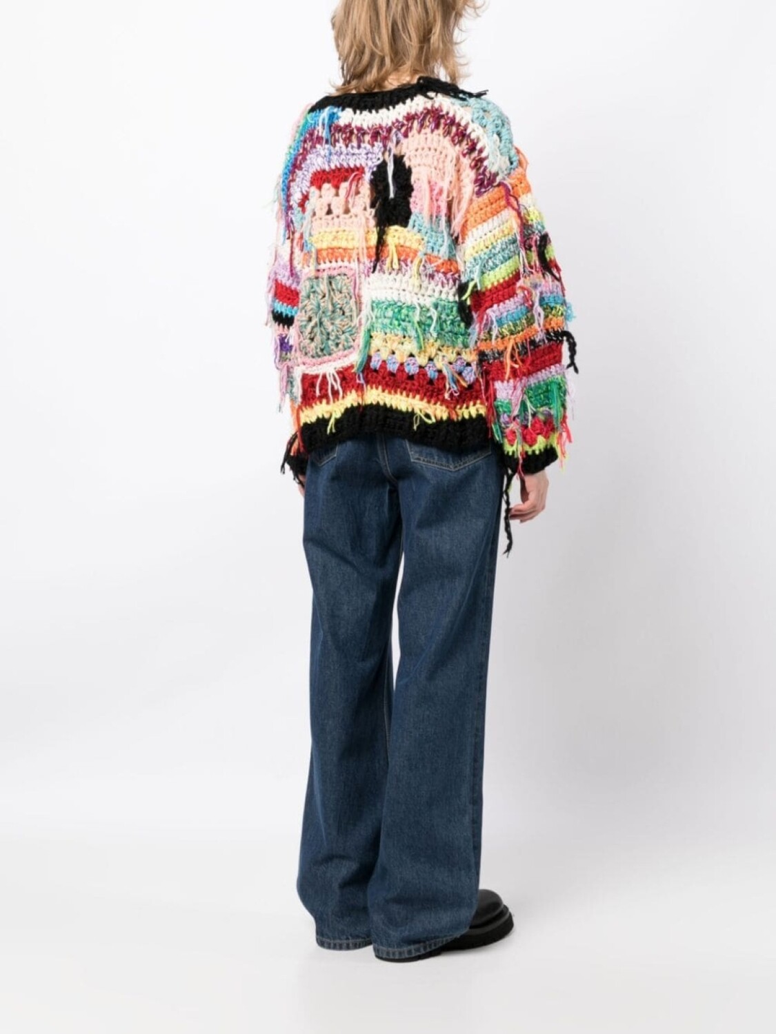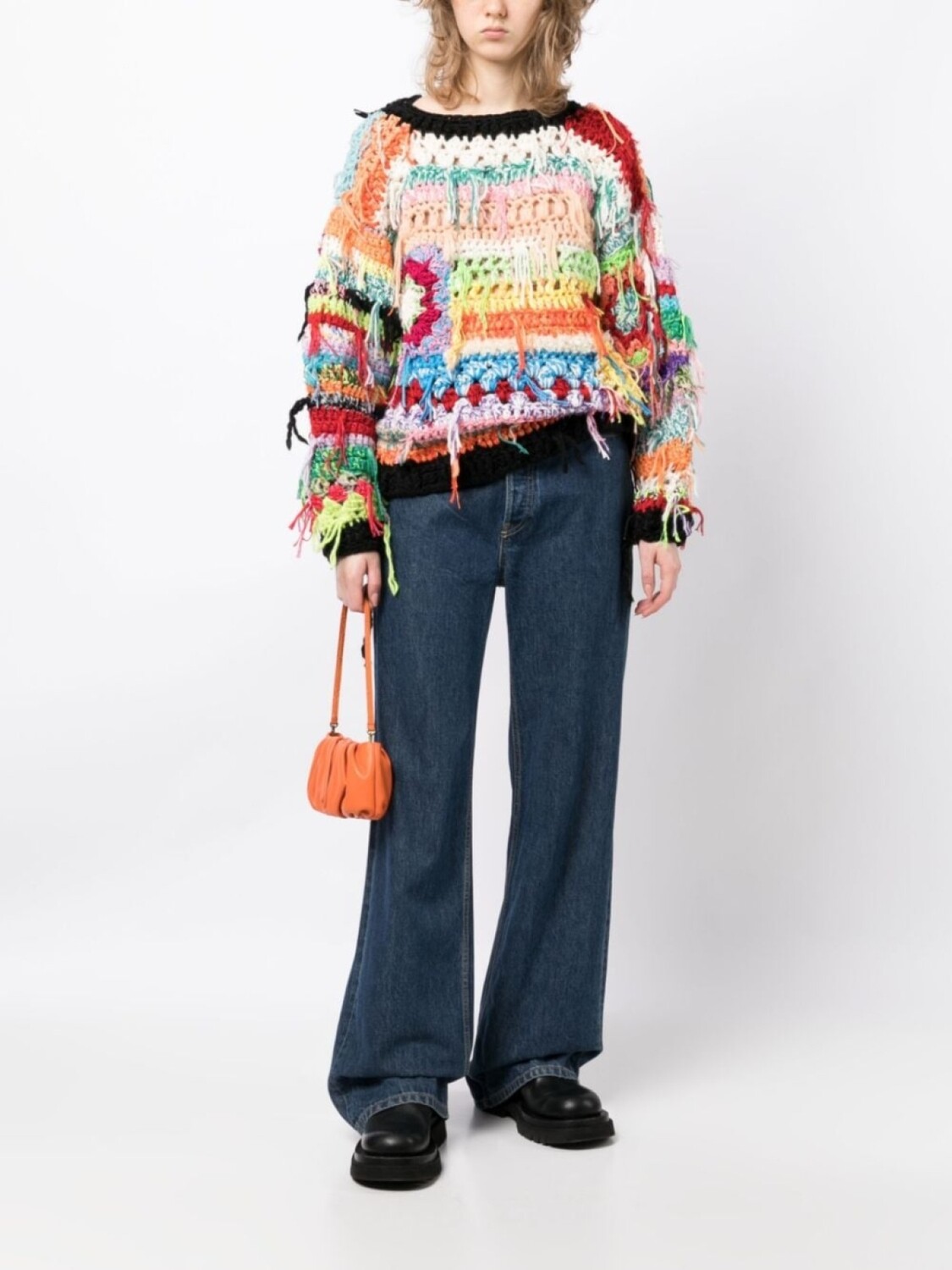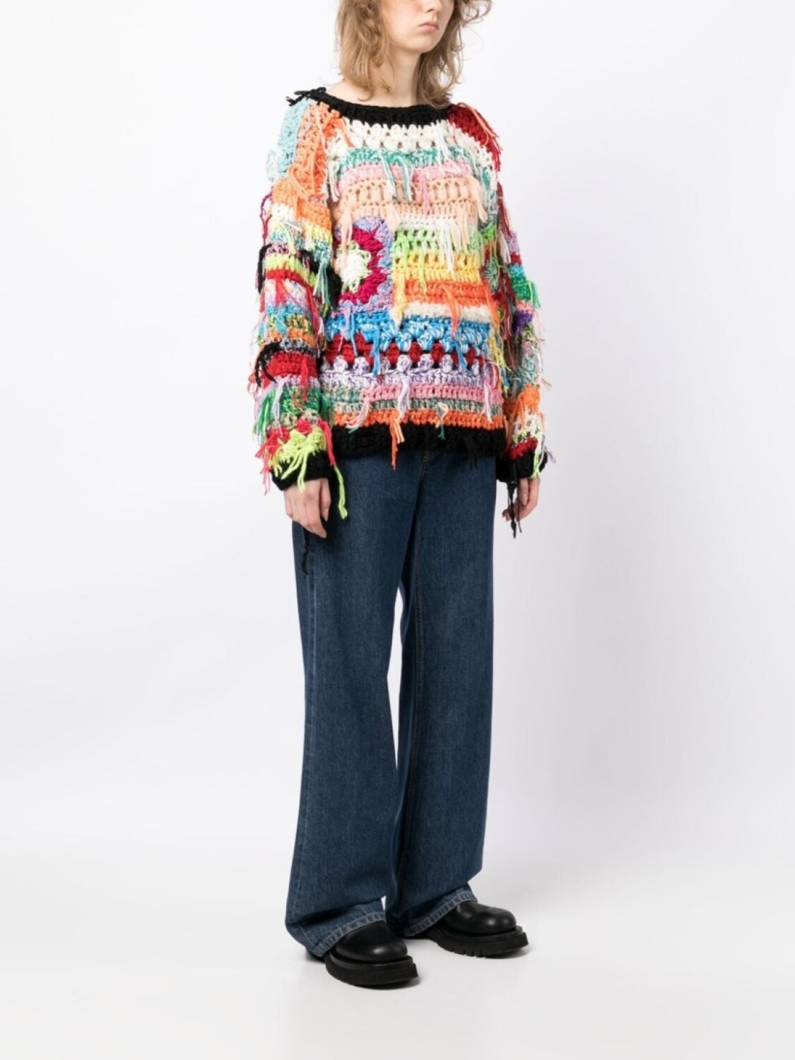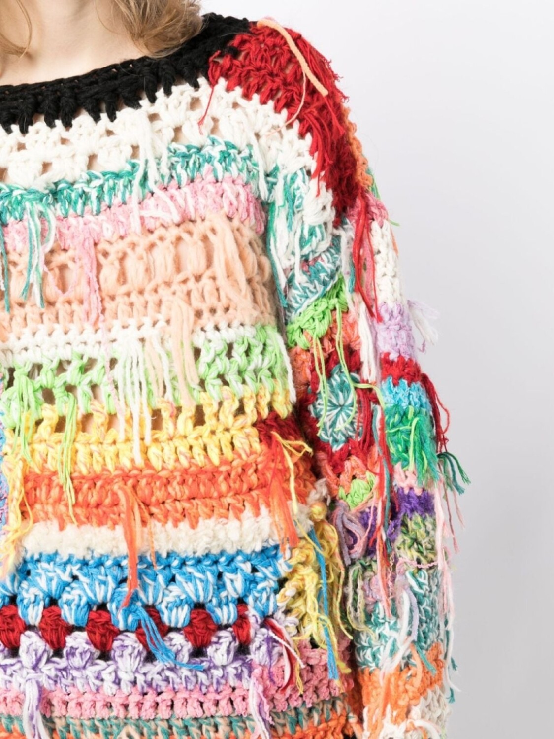Разноцветный, крупная вязка, кроше, цветочный узор, бахрома, круглый вырез, длинные рукава и прямой подол.