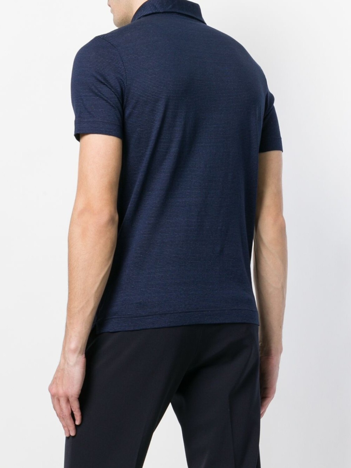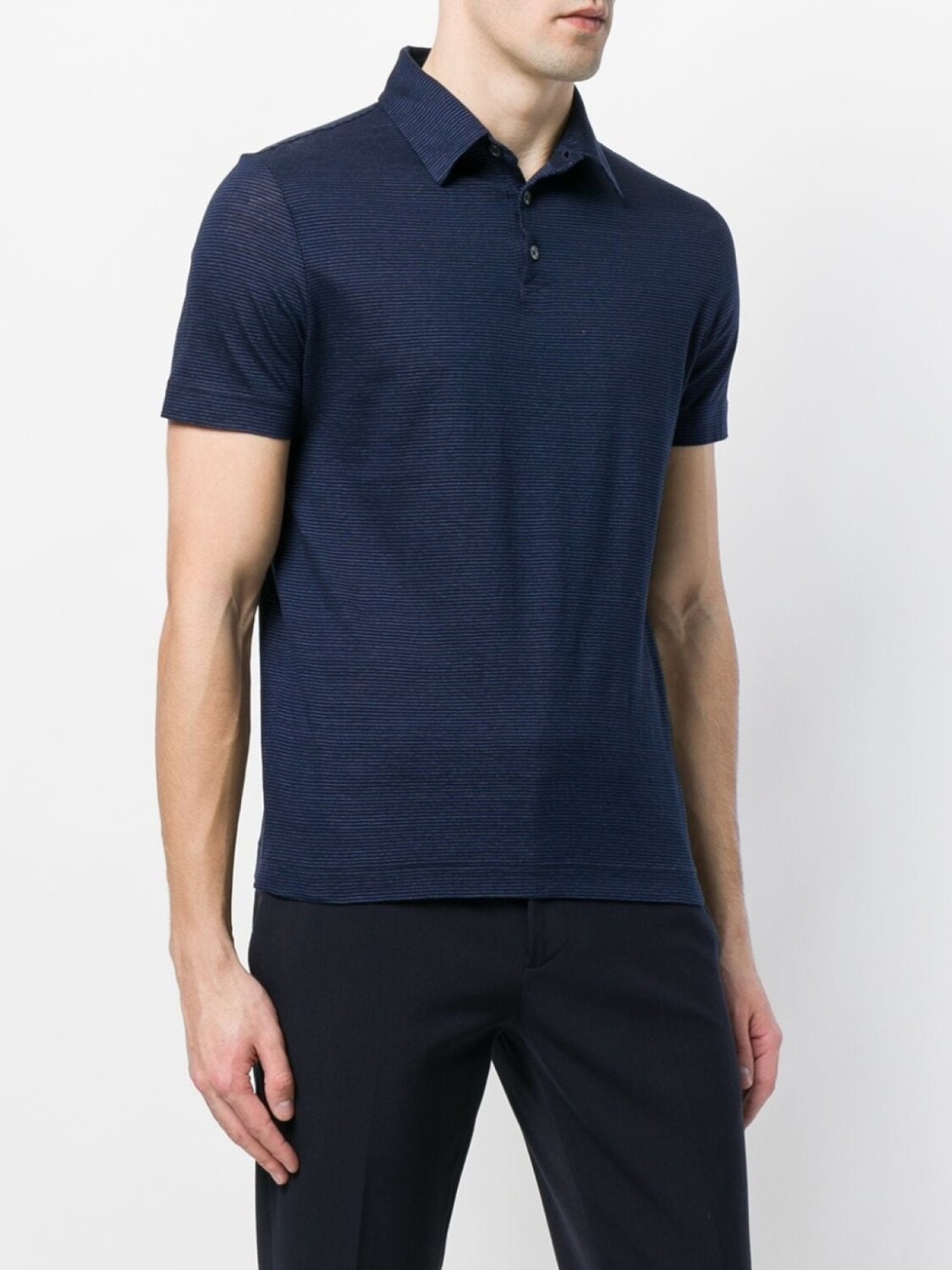 Темно-синяя рубашка-поло из микса хлопка и льна в полоску от Zanone. Классический воротник-поло, планка на пуговицах спереди, короткие рукава, прямой подол.