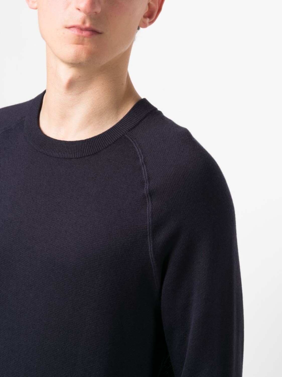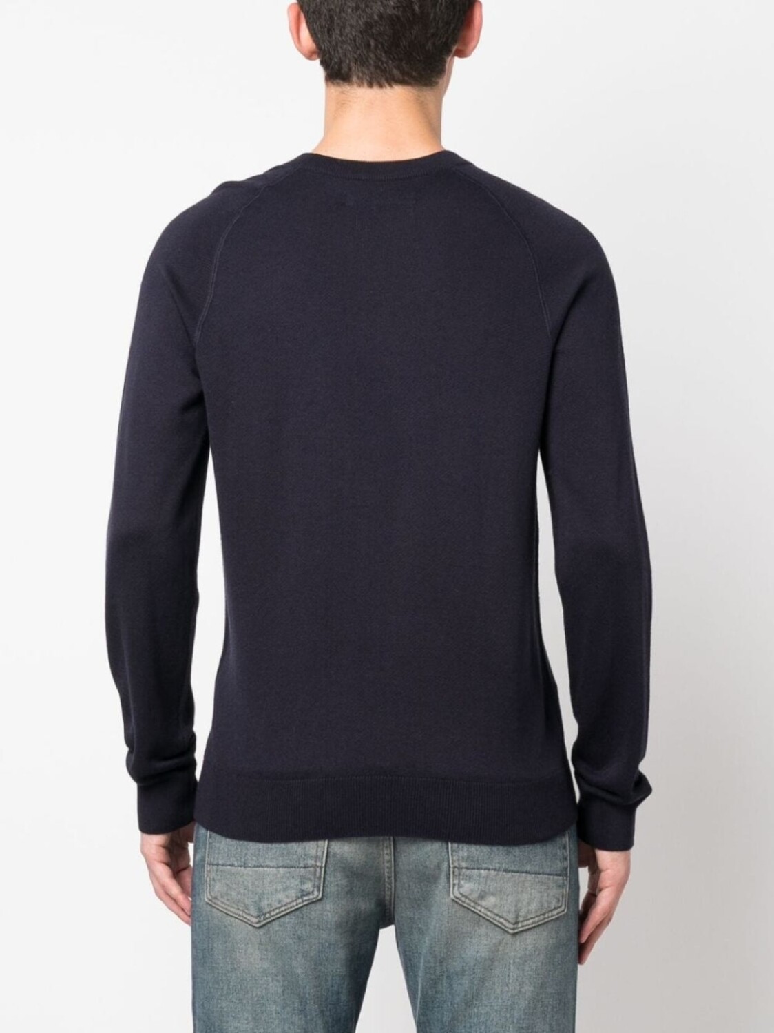 Темно-синий, смесь хлопка и шелка, трикотажный материал, логотип в технике интарсия, круглый вырез, длинные рукава и прямой подол.