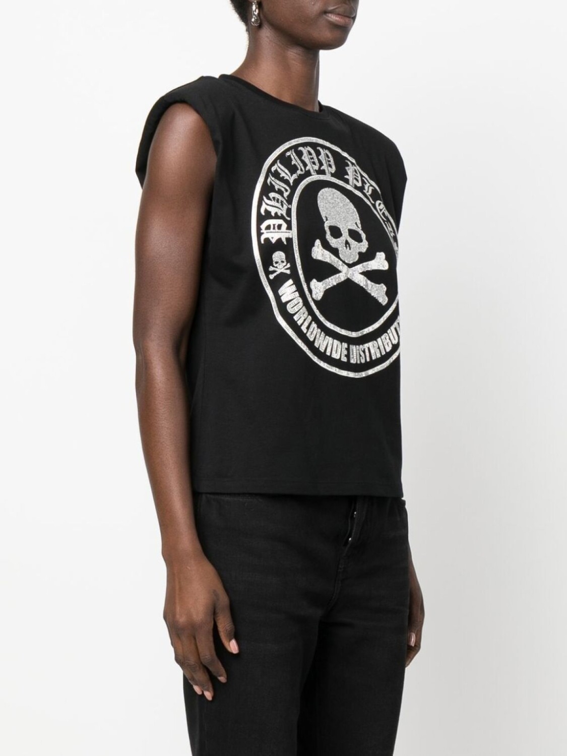 Черный, хлопок, декор из кристаллов, принт с изображением черепа спереди, логотип спереди, нашивка с логотипом сзади, подплечники, круглый вырез, без рукавов и прямой подол.