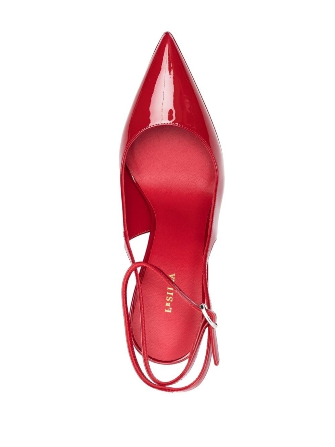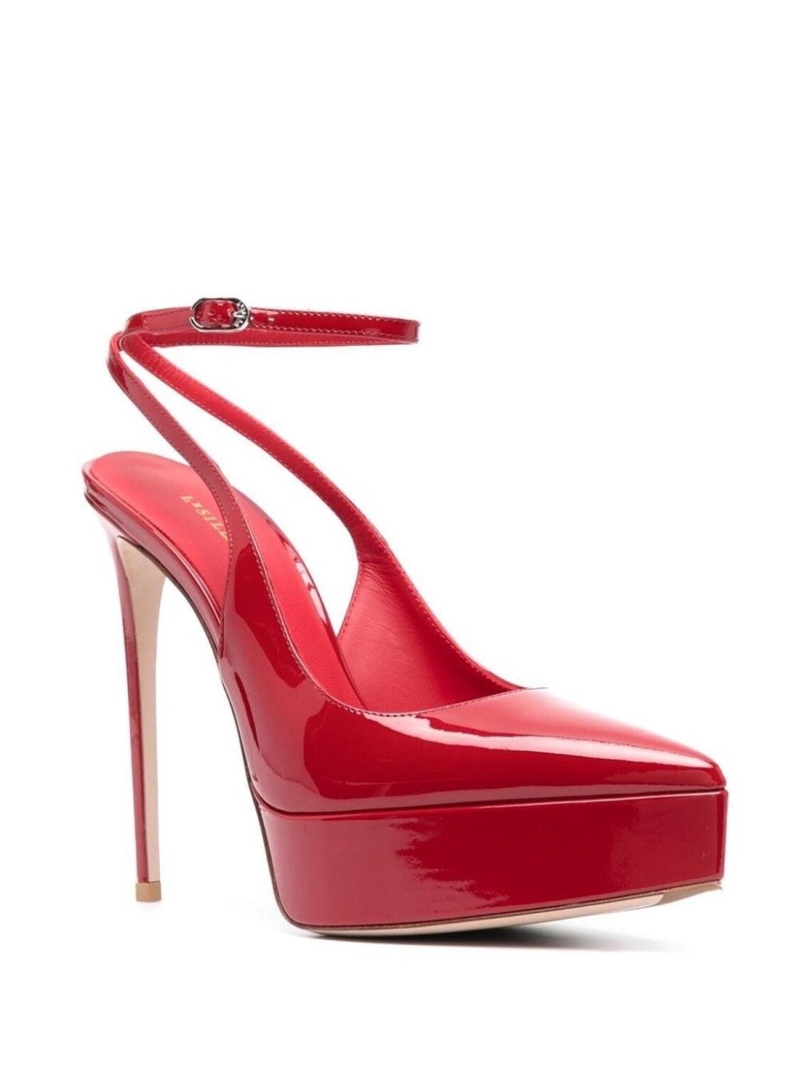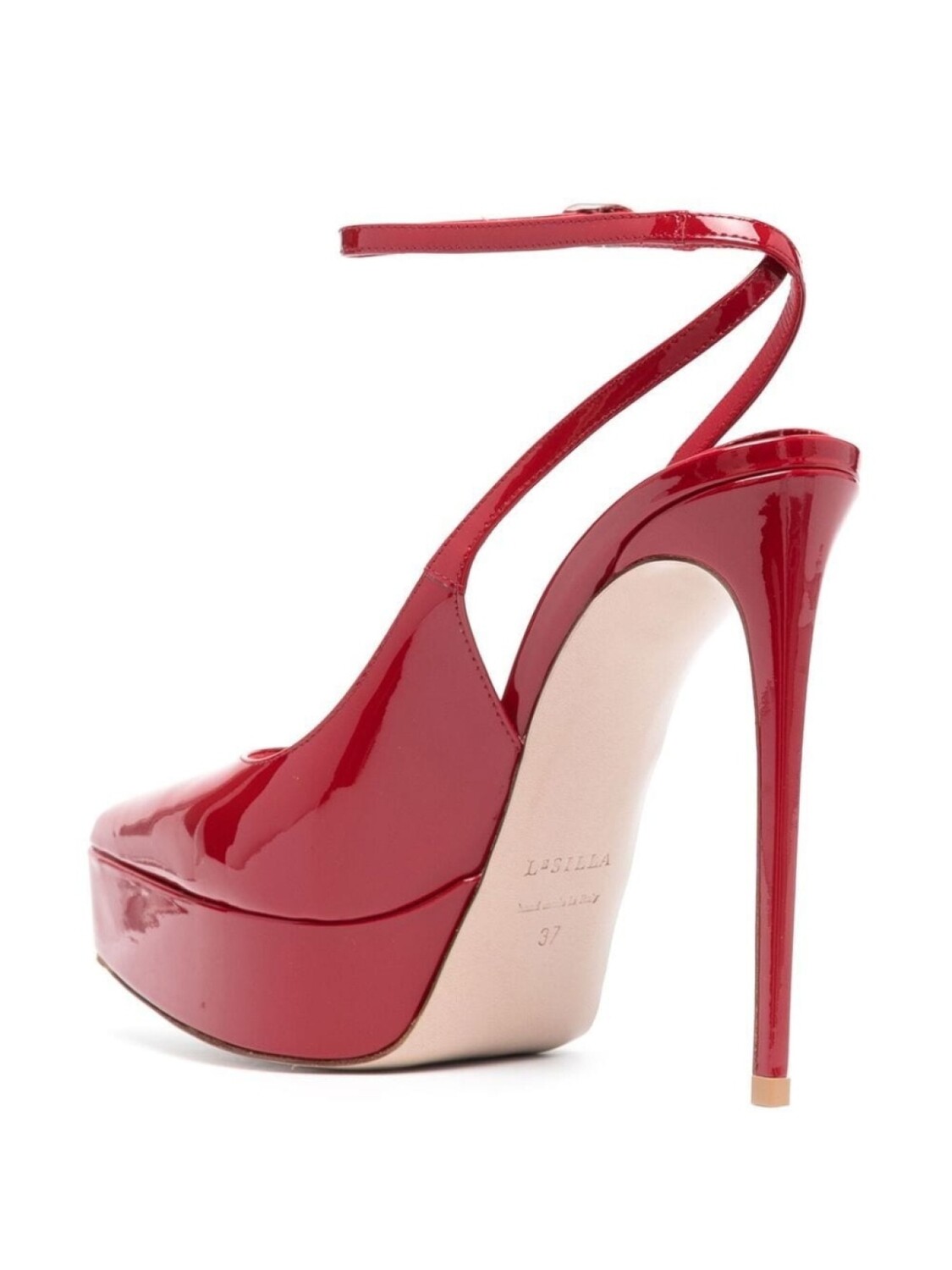 Кроваво-красный, лакированная кожа, заостренный носок, ремешок на пятке, застежка на пряжке, подошва на платформе и каблук на высокой шпильке.