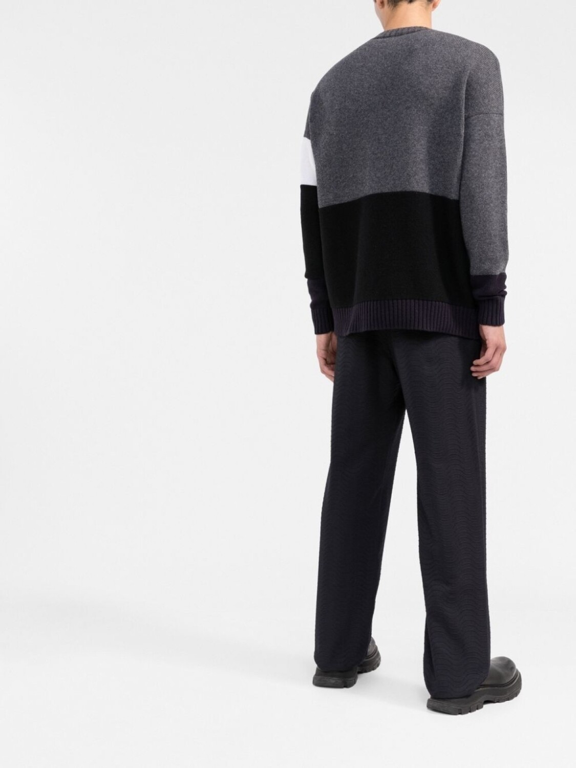 Черный/серый, необработанная шерсть, детали в рубчик, длинные рукава, прямой подол, сочетание двух оттенков, дизайн колор-блок и прямой подол.