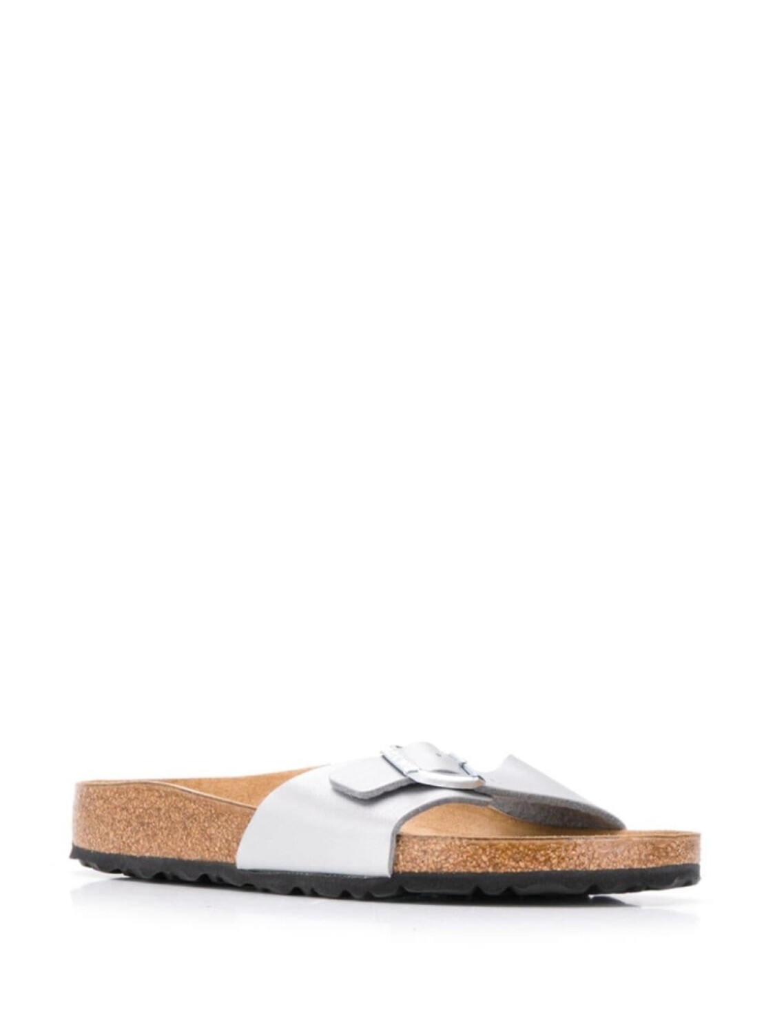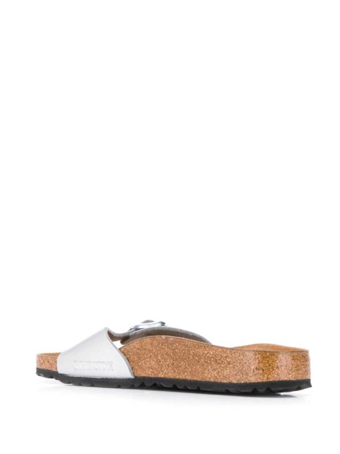 Сандалии Madrid Oiled от Birkenstock. Плоская резиновая подошва, закругленный носок, застежка на серебристой пряжке и стелька с тиснением бренда.